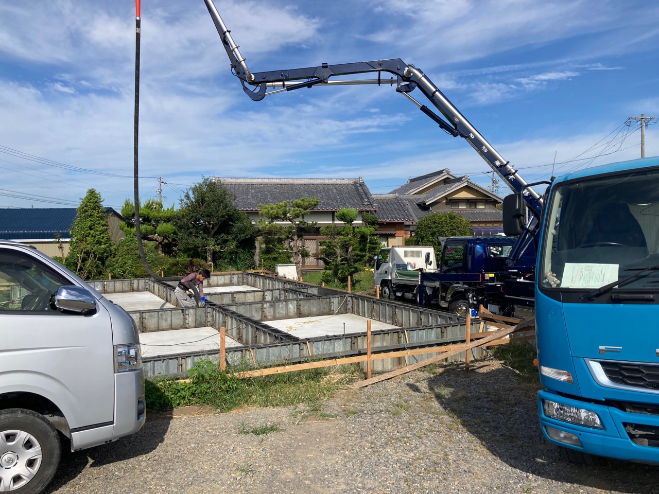 コンクリート打設はいよいよ南世帯へかかっていきます。北世帯とは微妙に離れていますので、ポンプ車も位置を移動して据え直し。両世帯を『微妙に離す』事のできるこの敷地の広さがウラヤマシイ。
