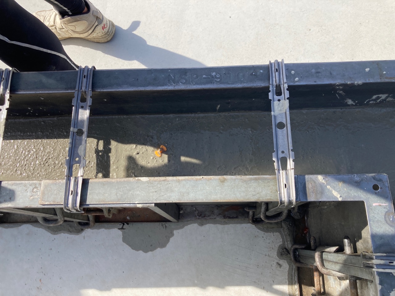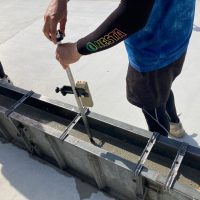 先程のオレンジのスクリューの天端に合わせてレベラーを流し込んでいきます。流し込みに使用しているクチバシ付きのバケツはコンクリート工事用の物ではなく、ホームセンターで買ってきた園芸用のもの。思わぬところで便利な使い方をされています。