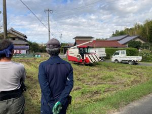 作業中、お隣の田んぼにやってきた稲刈りマシン。各々畑をしているお父様とt広さんは興味津々で、筆者には良く分からない農業用機械の専門用語が飛び交っています。