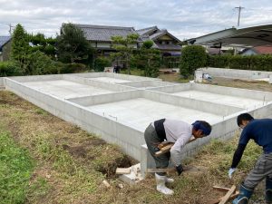 丁張り貫と杭も片付けて周囲を埋め戻して基礎工事はほぼ完了。後は天端のセルフレベリング材の高さの最終調整です。k長先生の設計手法として基礎には一切の配管用のスリーブを設けていません。なので基礎梁が直進してキレイに収まっています。