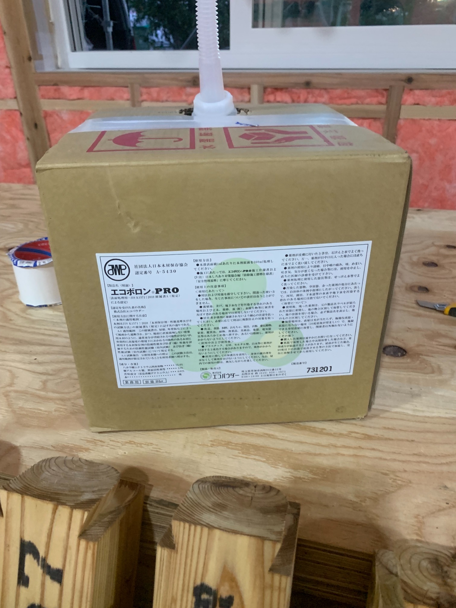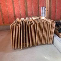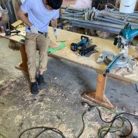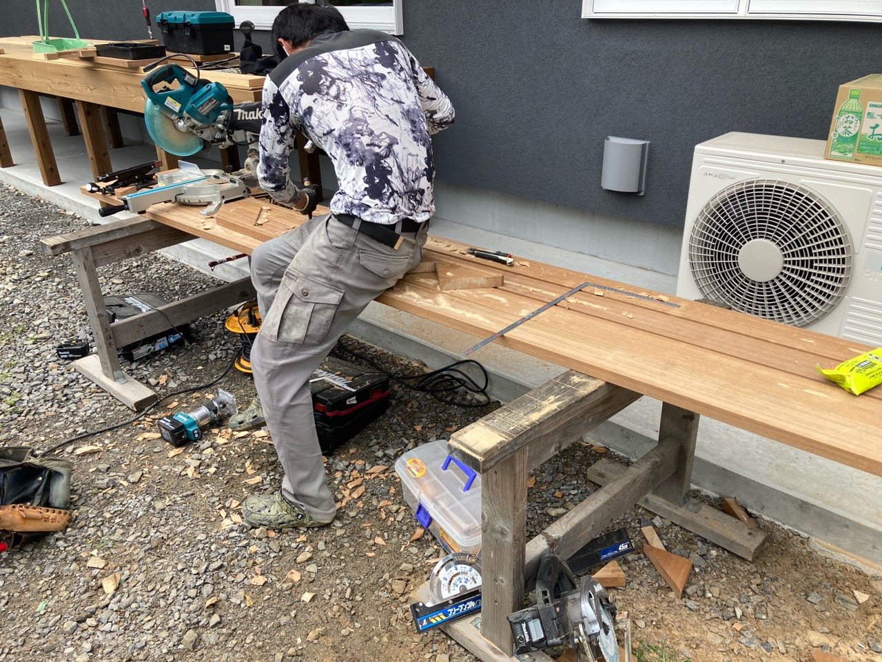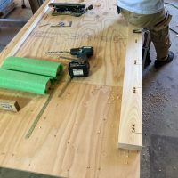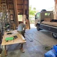さて、勉強会で賑やかにやっている傍らh谷川棟梁は黙々とデッキの階段制作にかかっています。KAMI式システムの住宅では1FLがGLから909㎜あり、(ミノワでは普段630㎜ほど)玄関出入口がかなり地面から高い位置になります。この高さを湿式のタイルなどのポーチにするとかなり存在感が出てしまい、また、防蟻の観点から玄関ポーチはデッキ形式とされています。使用するのは『セランカンバツ』という石のように固い樹種。デッキ一式作るだけで丸ノコの歯が1枚切れなくなり、留め付けビスを打ち込むとインパクトレンチのトルクに耐えきれなくなりビス頭が飛ぶなど非常に職人泣かせの樹種でありますが、その分耐候性、耐食性に優れた樹種だとも言えます。