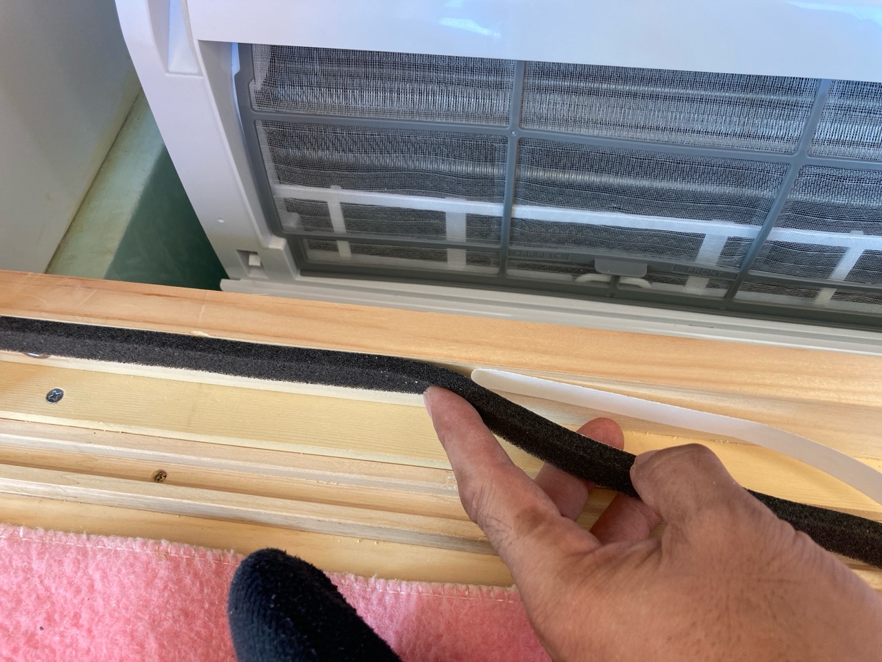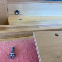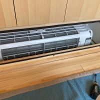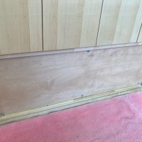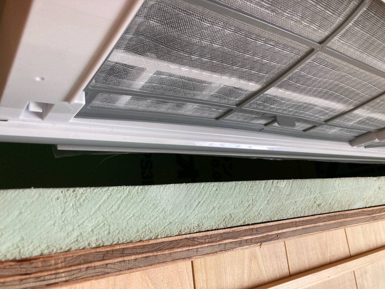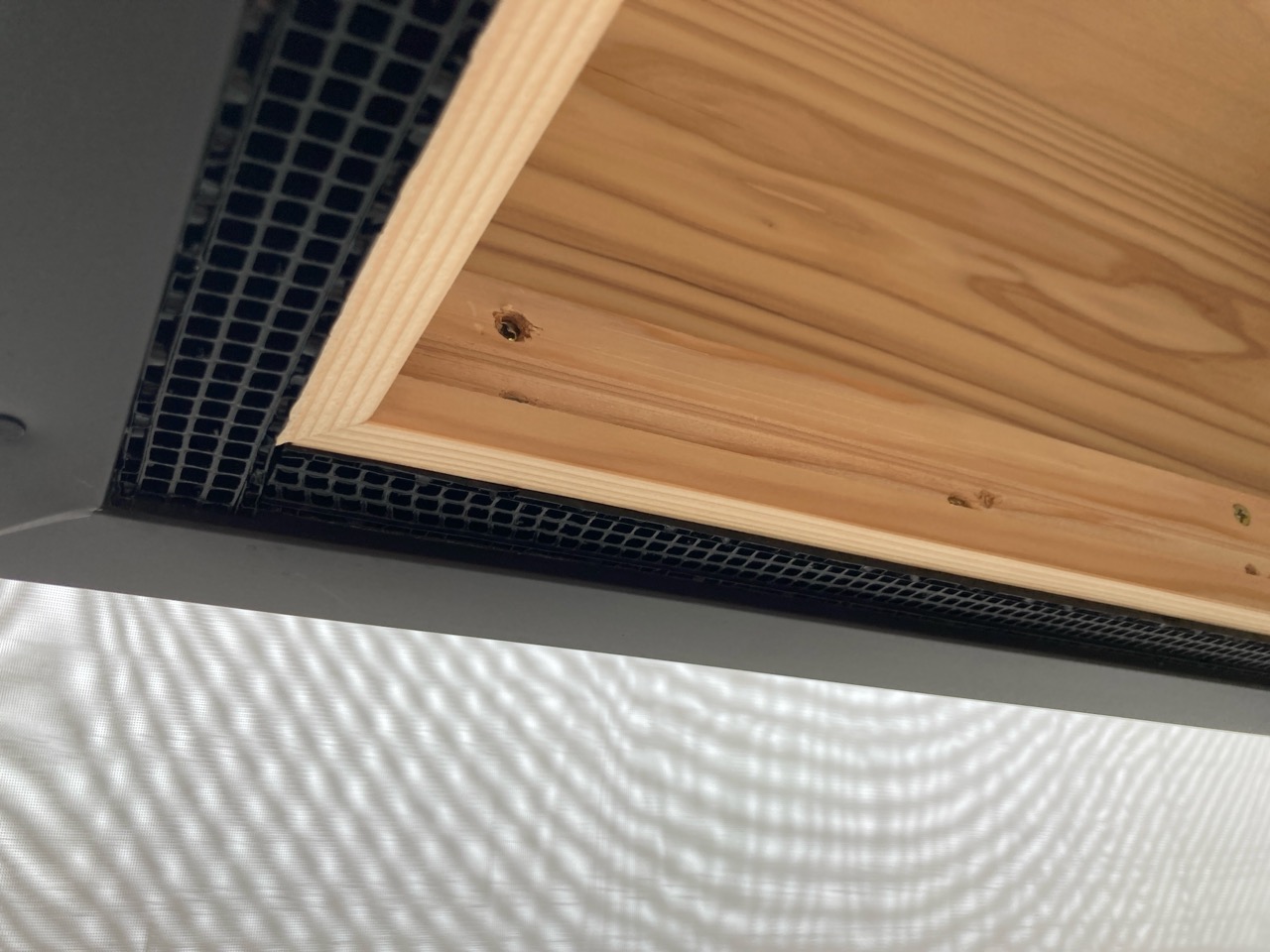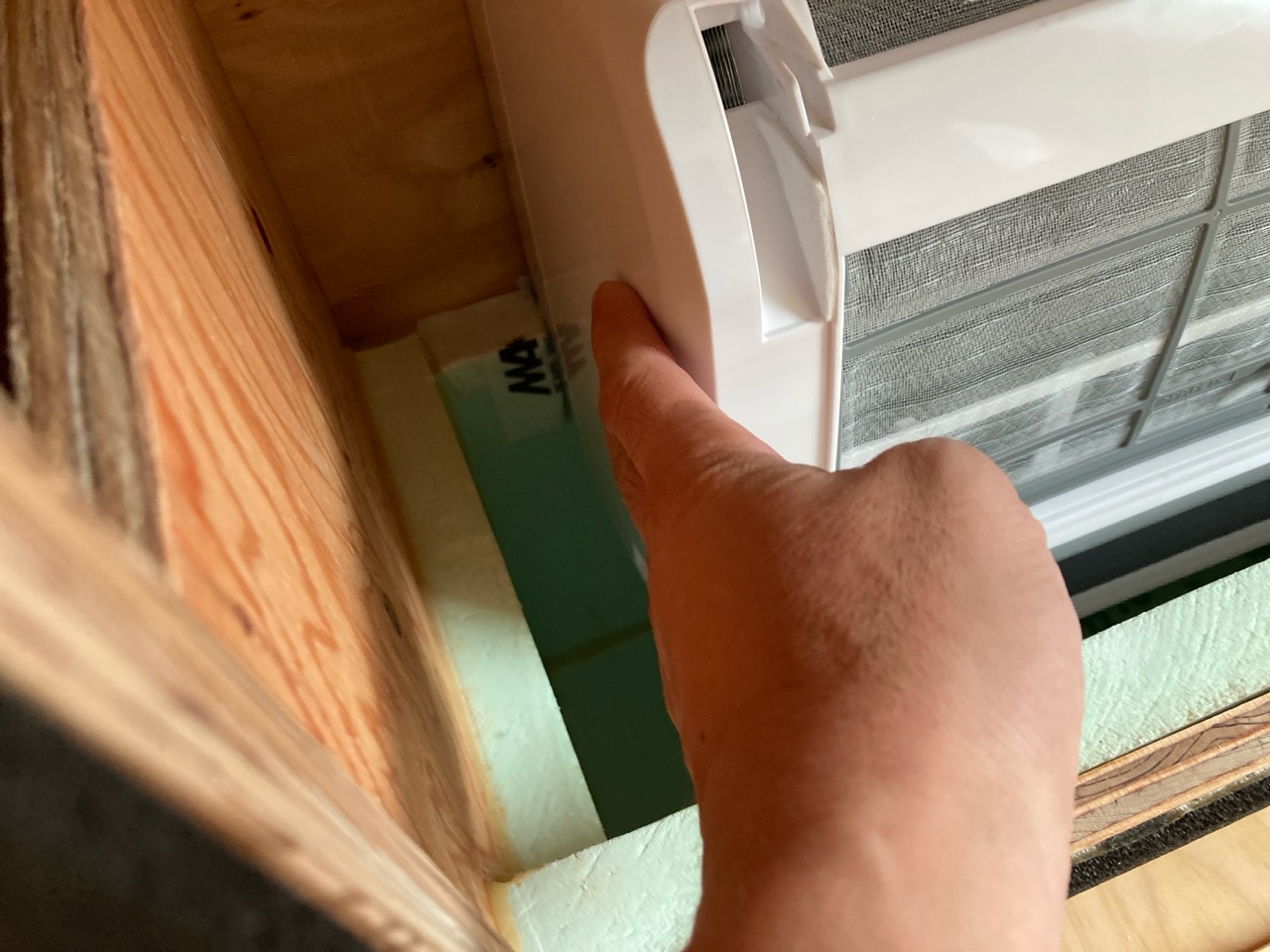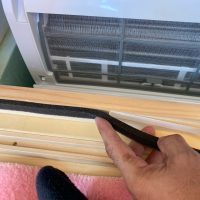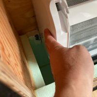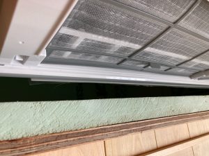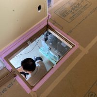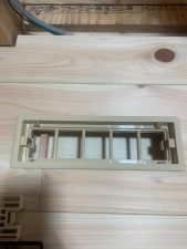 設備業者さんが灼熱の中働いているところ、筆者は北世帯のエアコンボックスの改良にチャレンジしてみました。エアコンボックスの蓋はエアコンからの風が漏れないようにパッキンを打ちまわしていますが、フタはケンドン式になっています。意匠上、取手をつける事ができないので、パッキンの摩擦力、粘着力もあり、なかなか開閉が困難です。そこで正面から伏せて固定できるフタはできないものかといろいろと考えてみて造ってみました。