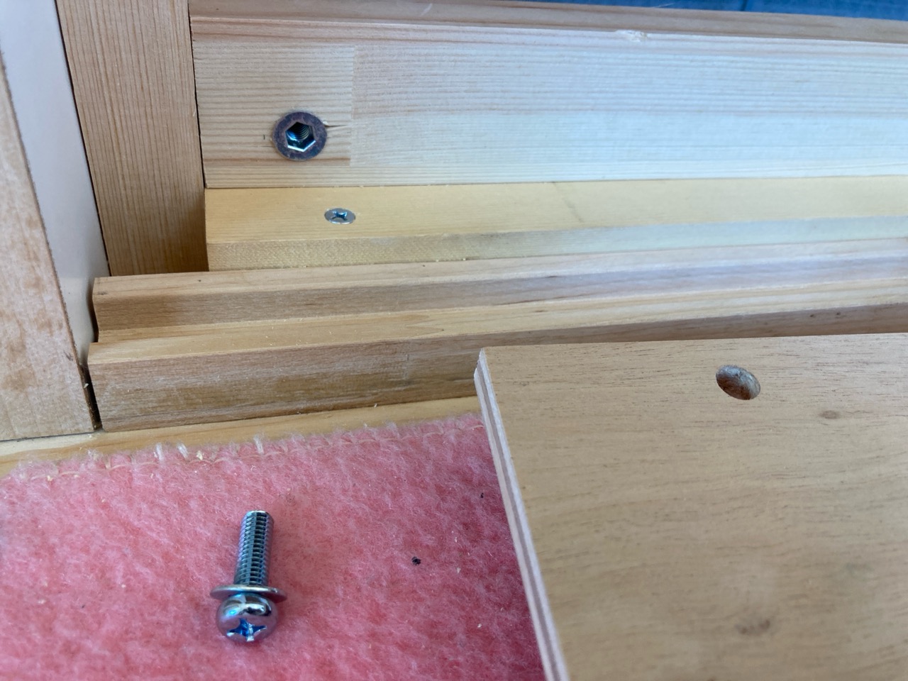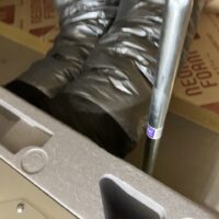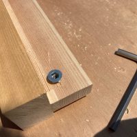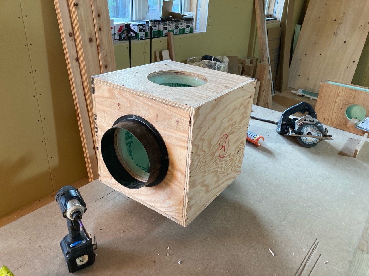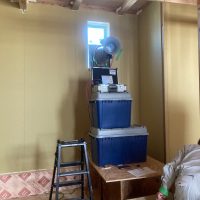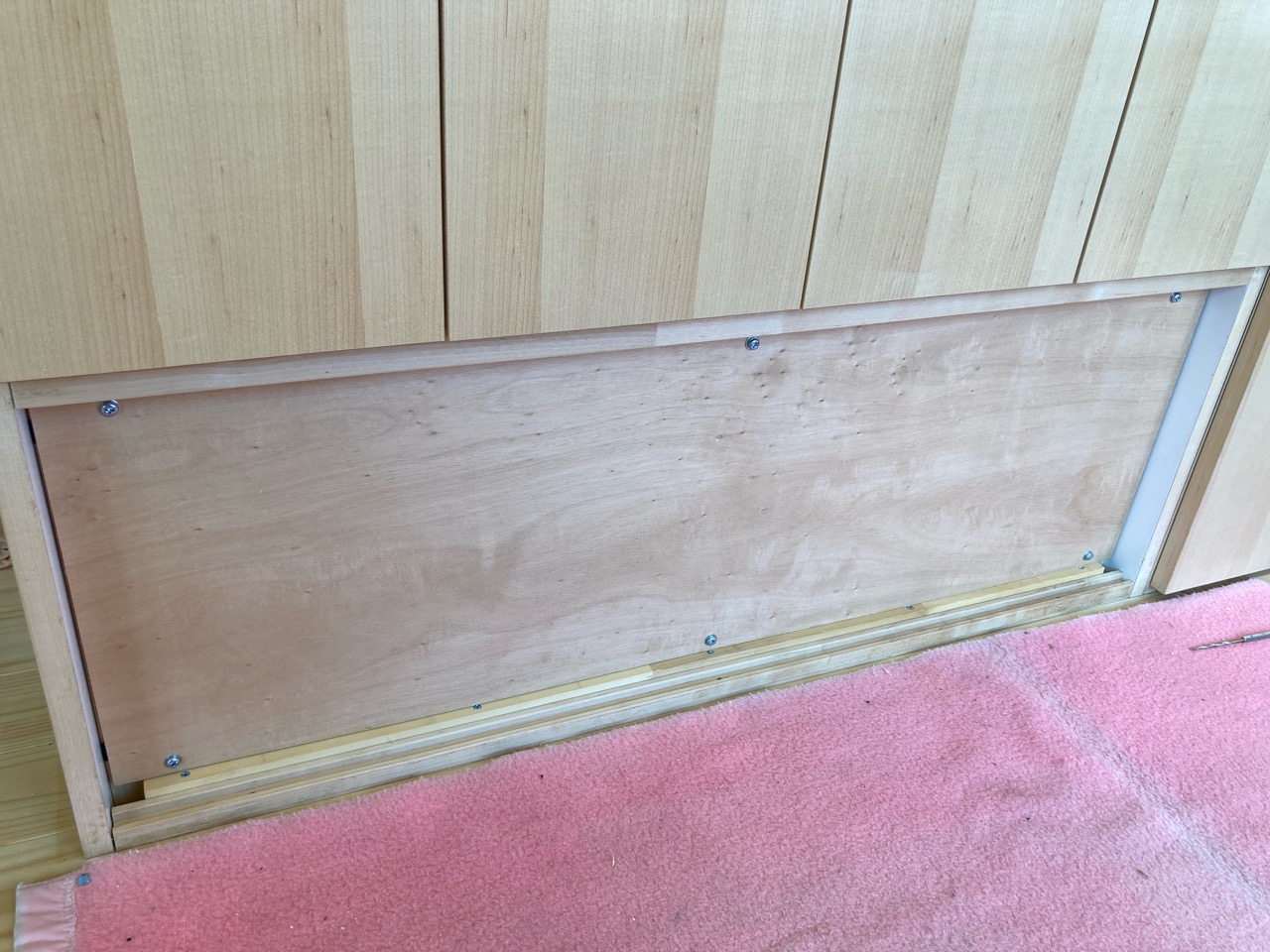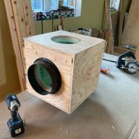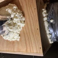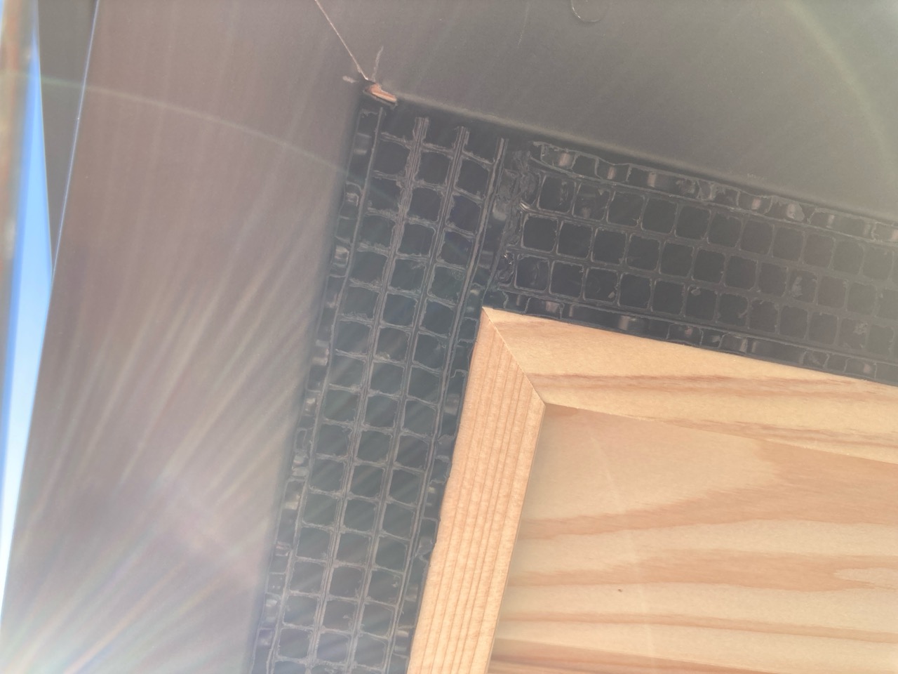 設備業者さんが灼熱の中働いているところ、筆者は北世帯のエアコンボックスの改良にチャレンジしてみました。エアコンボックスの蓋はエアコンからの風が漏れないようにパッキンを打ちまわしていますが、フタはケンドン式になっています。意匠上、取手をつける事ができないので、パッキンの摩擦力、粘着力もあり、なかなか開閉が困難です。そこで正面から伏せて固定できるフタはできないものかといろいろと考えてみて造ってみました。