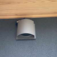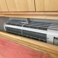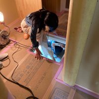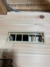 先日試運転をした換気、空調システムの動作をチェック。視覚でわかりやすいようにビニ紐で吹き流しをつくってみました。冷房も暖房も個の床の給気口から吹き出すようになっています。風量を調節する場合はガラリをいったん取外し、内部のフタの開閉で調節する事ができます。