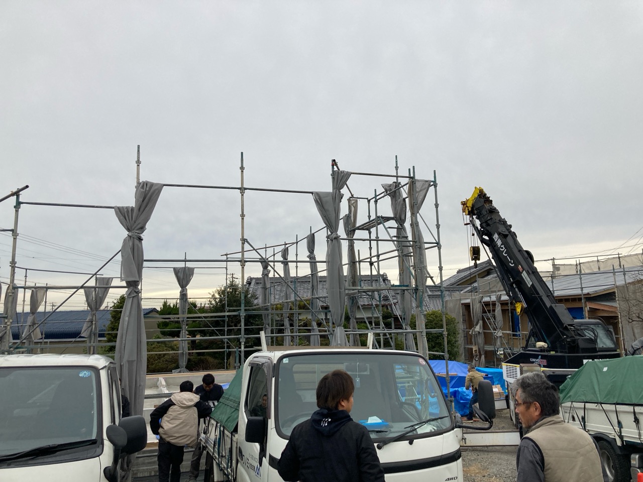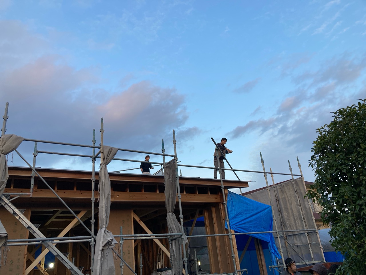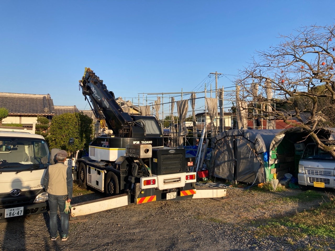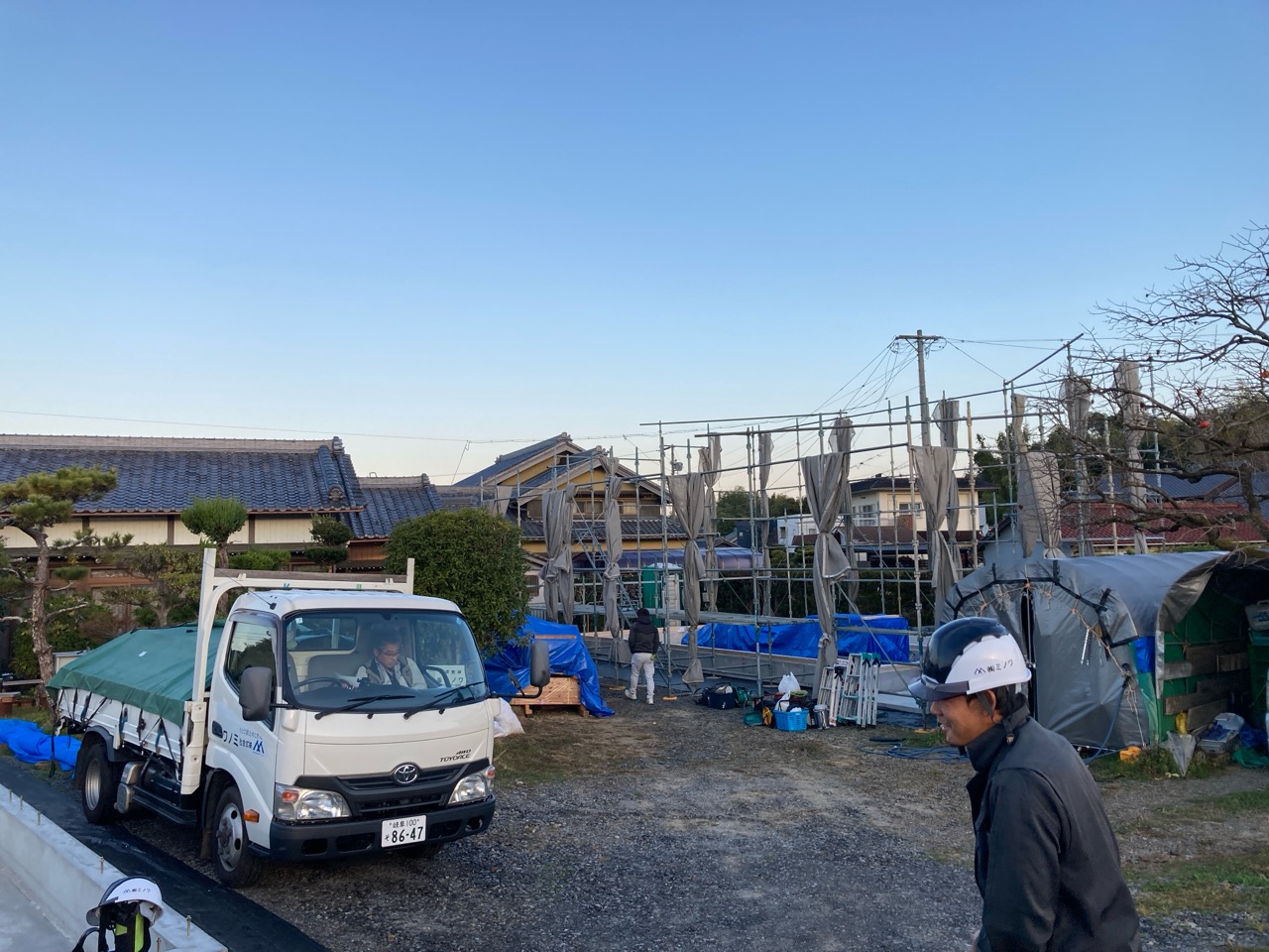 朝方は非常にシバレル寒さになってきた11月も終わりの本日、まずは北世帯の上棟を行いました。まだ完全に日は昇っていませんが、今のところ雲一つない快晴です。大工さんも前日から宿泊した人、早朝に岐阜を発った人、かなり早く現場に着き、作業開始を待っています。