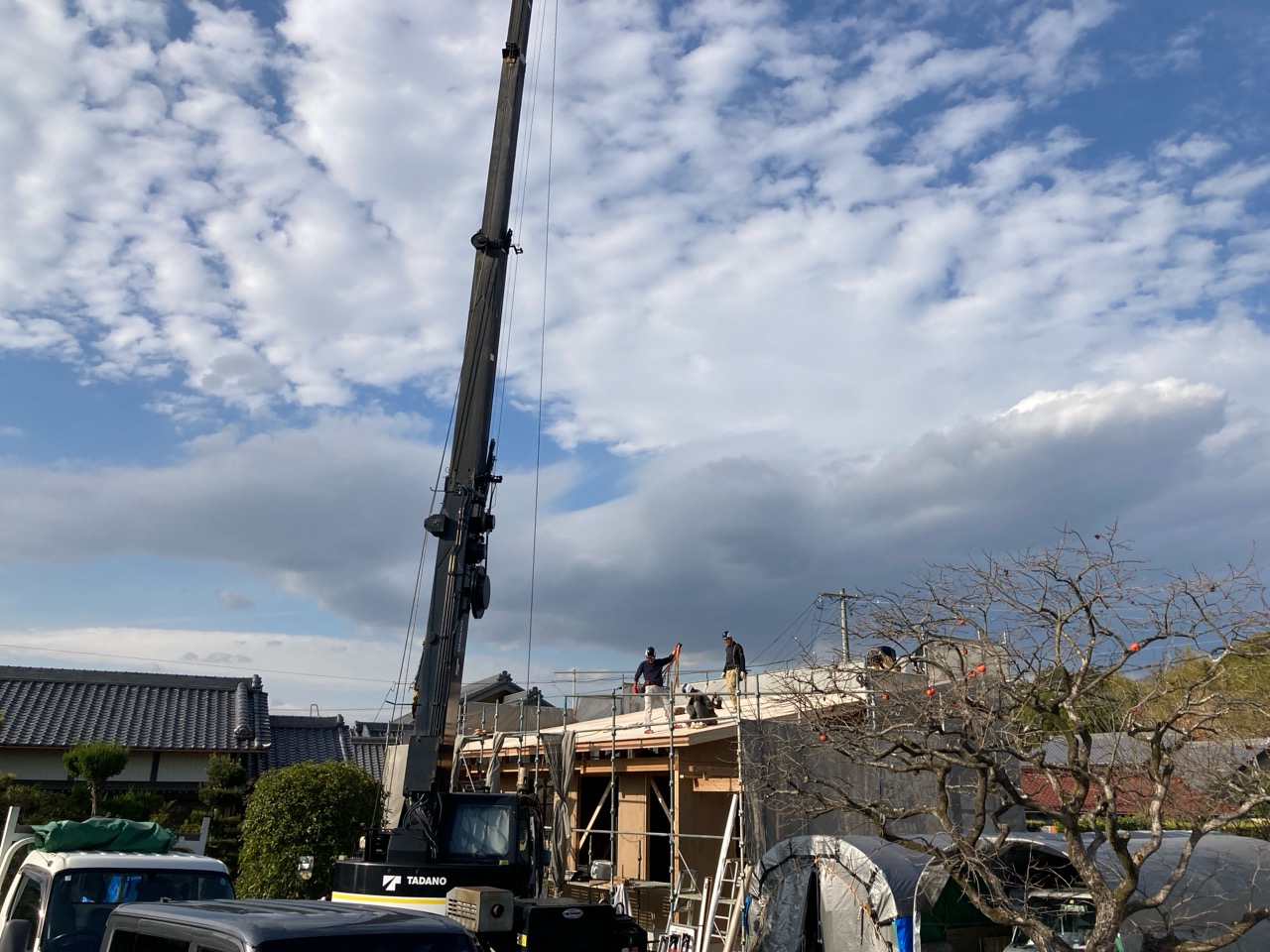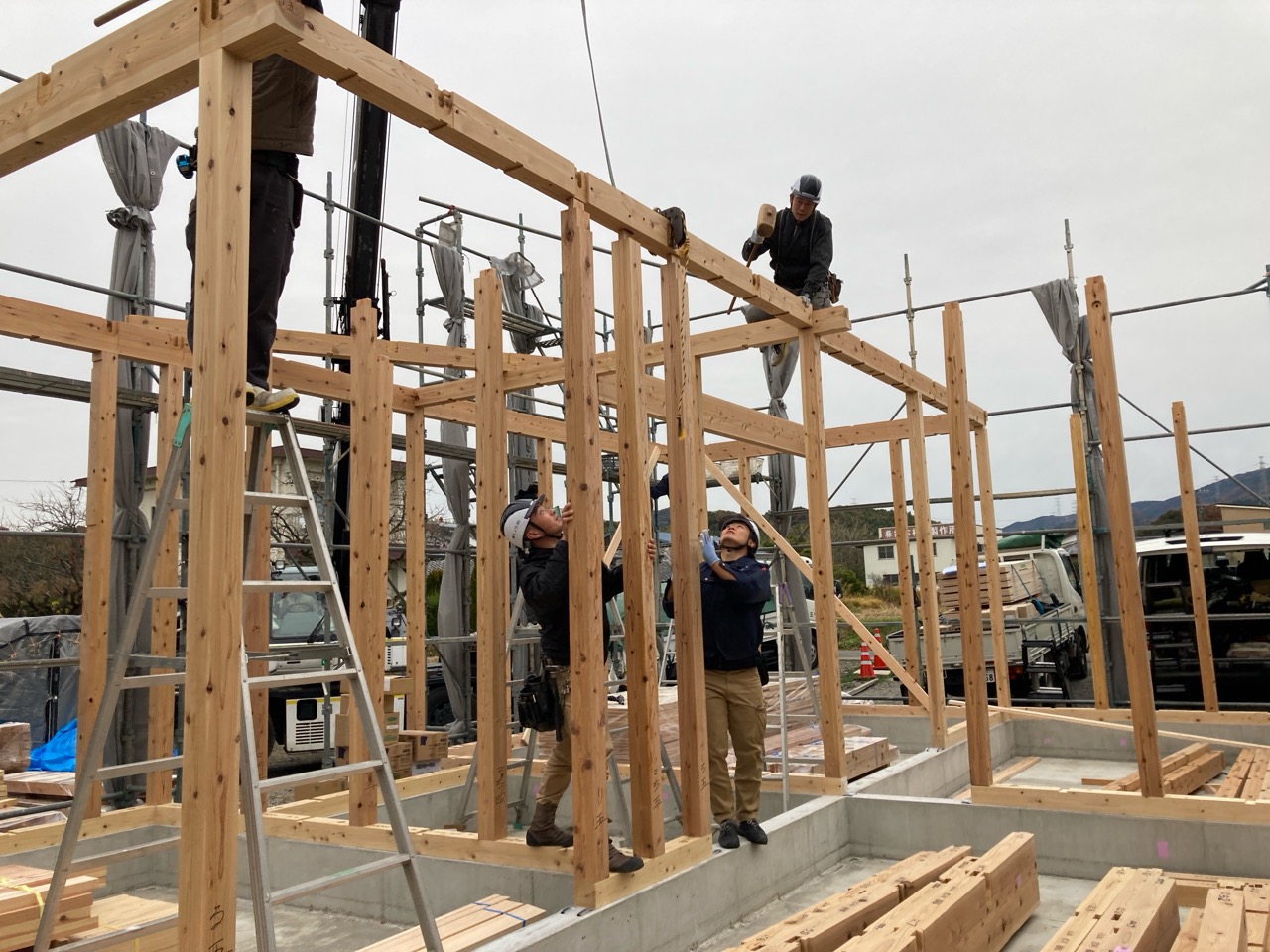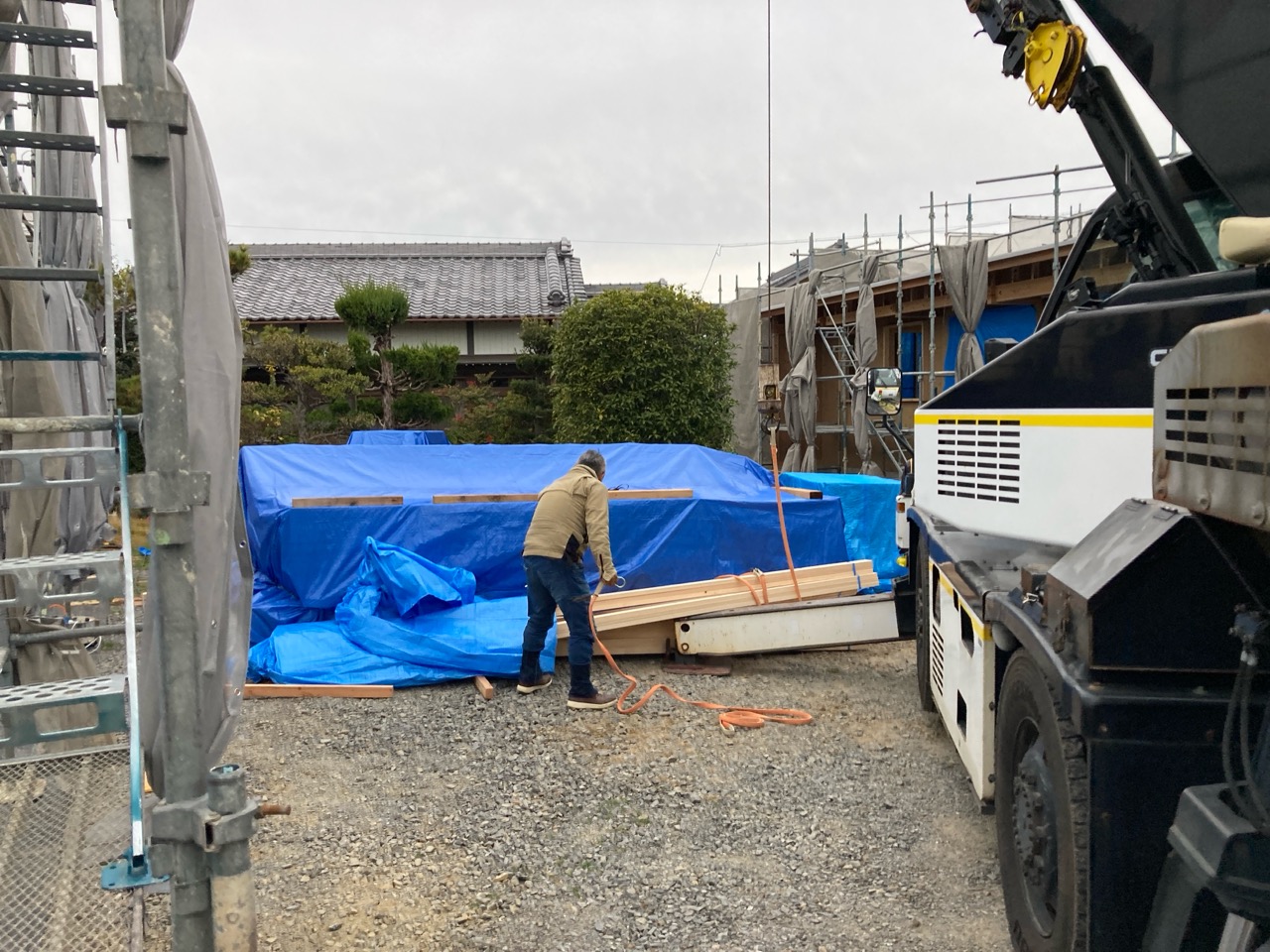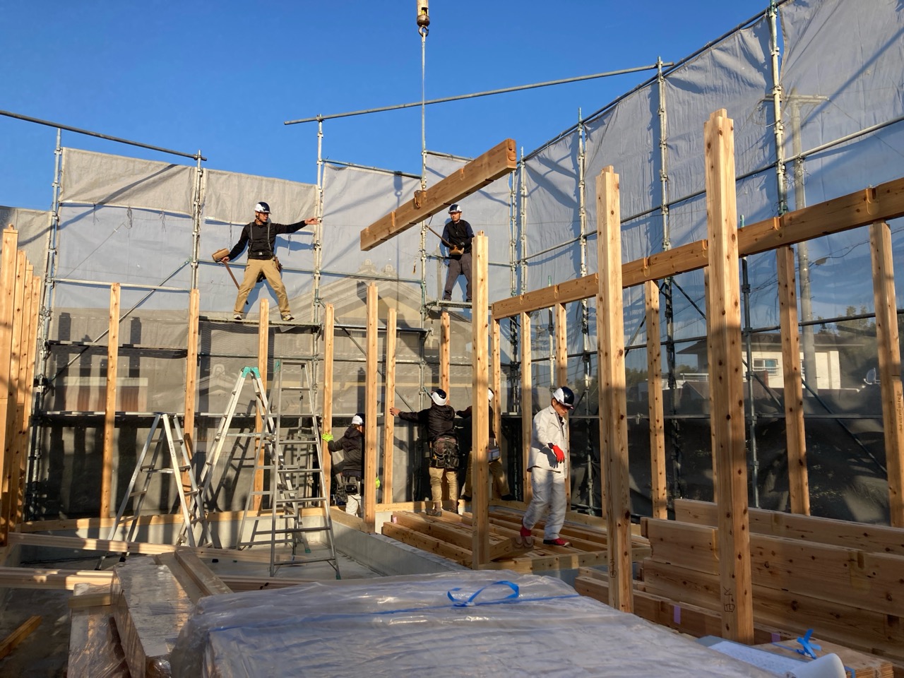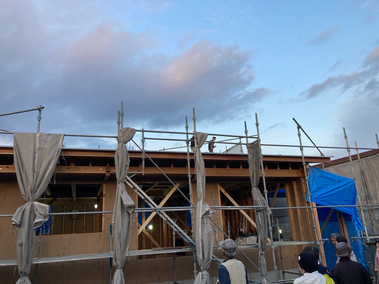 朝方は非常にシバレル寒さになってきた11月も終わりの本日、まずは北世帯の上棟を行いました。まだ完全に日は昇っていませんが、今のところ雲一つない快晴です。大工さんも前日から宿泊した人、早朝に岐阜を発った人、かなり早く現場に着き、作業開始を待っています。