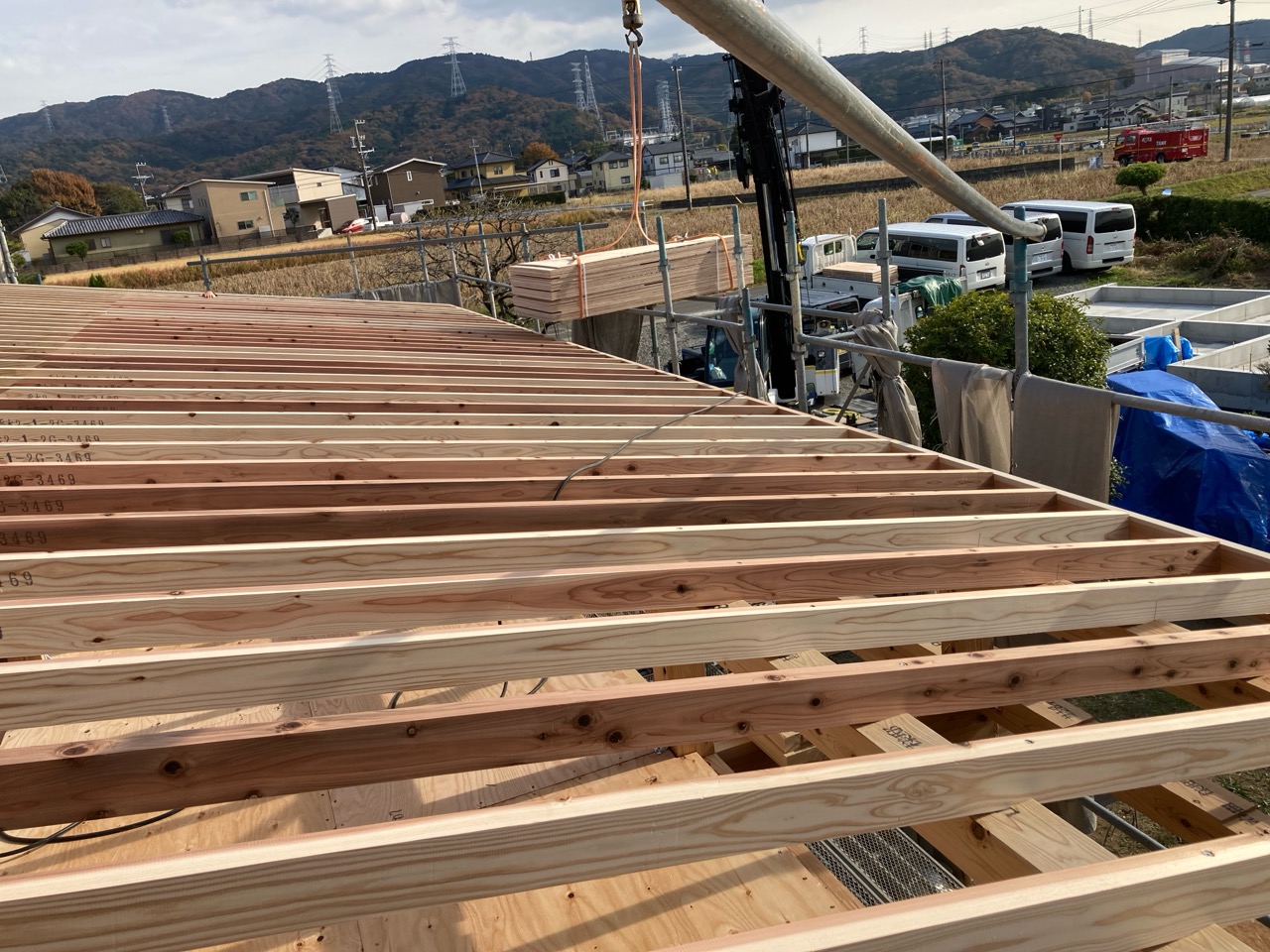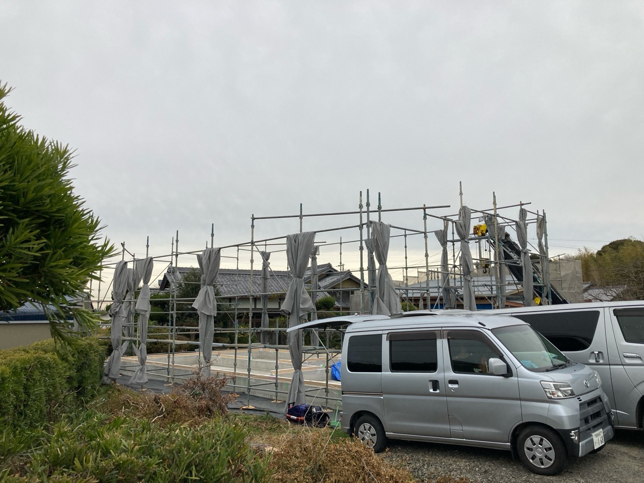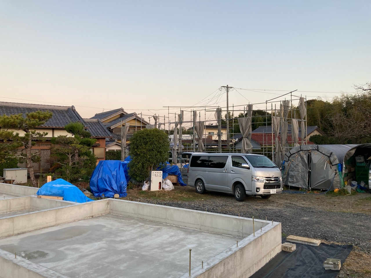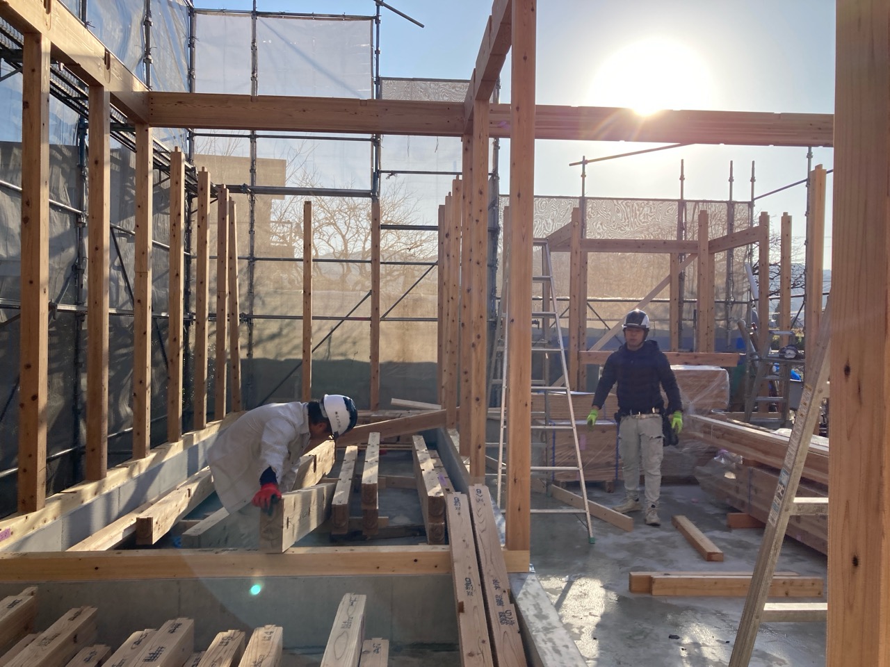 朝方は非常にシバレル寒さになってきた11月も終わりの本日、まずは北世帯の上棟を行いました。まだ完全に日は昇っていませんが、今のところ雲一つない快晴です。大工さんも前日から宿泊した人、早朝に岐阜を発った人、かなり早く現場に着き、作業開始を待っています。