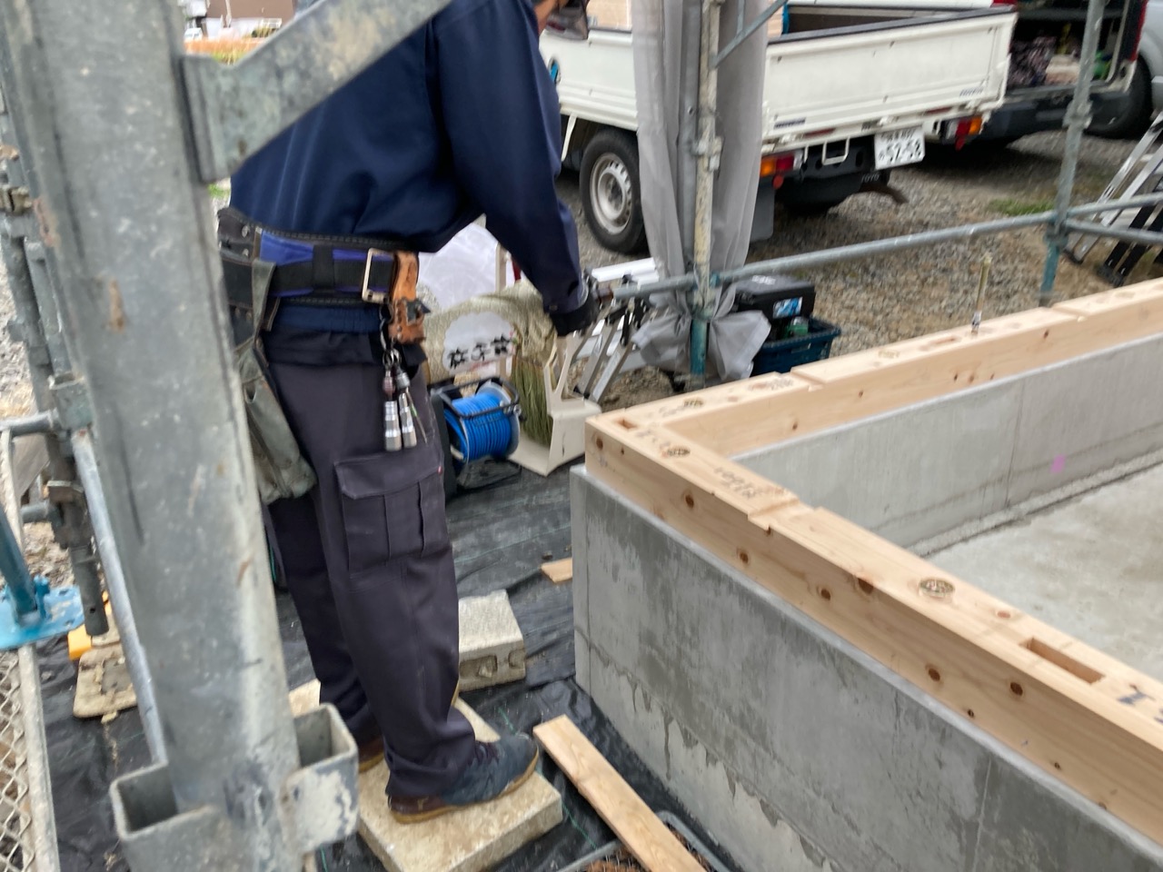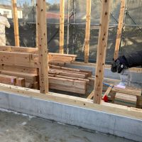 本日は土台伏せ工事にやって来ました。まずは北世帯の建物から始めます。と言っても実際に現場に行っているのは棟梁です。ブログ用に作業中の写真を送ってもらいました。