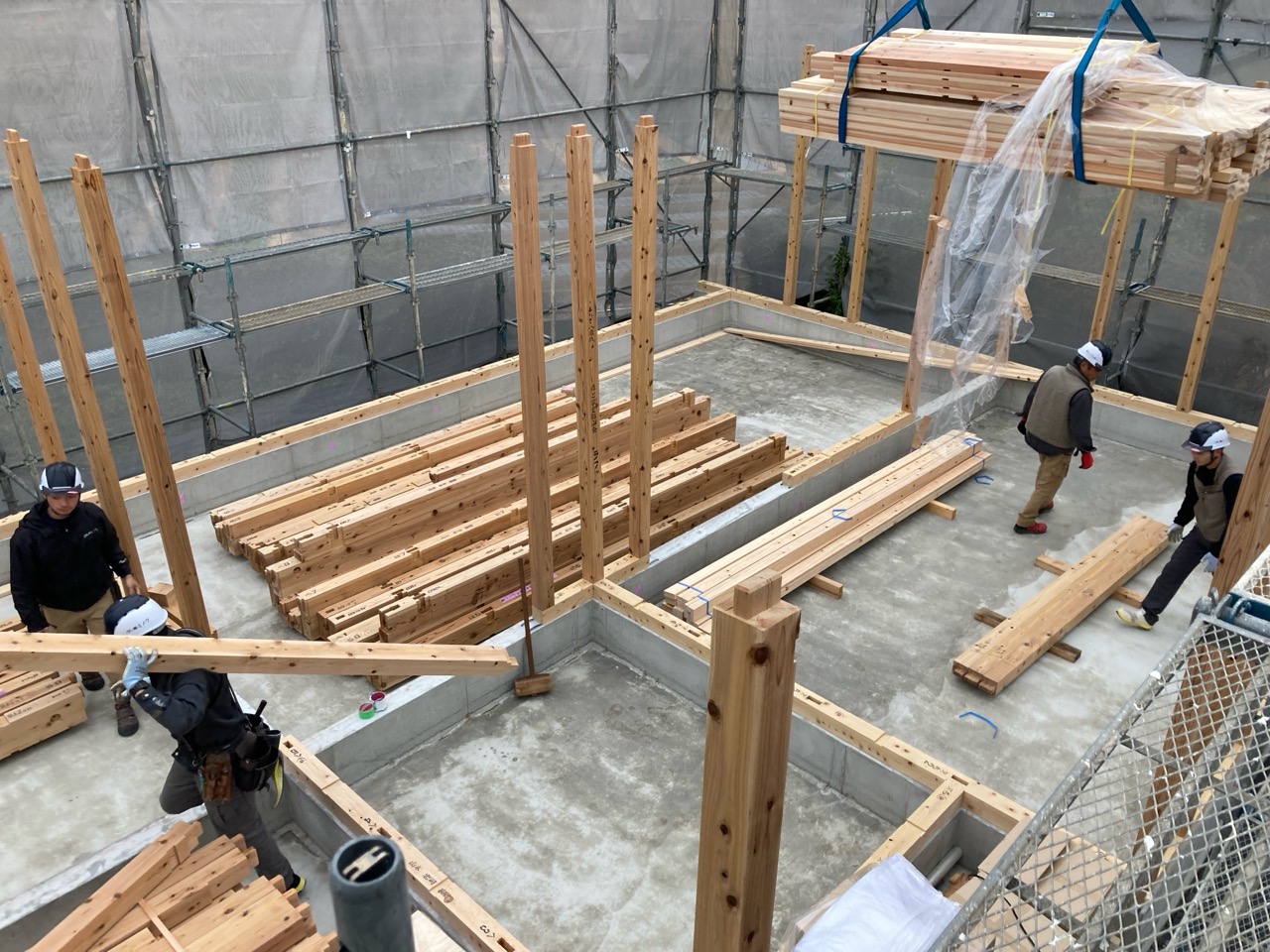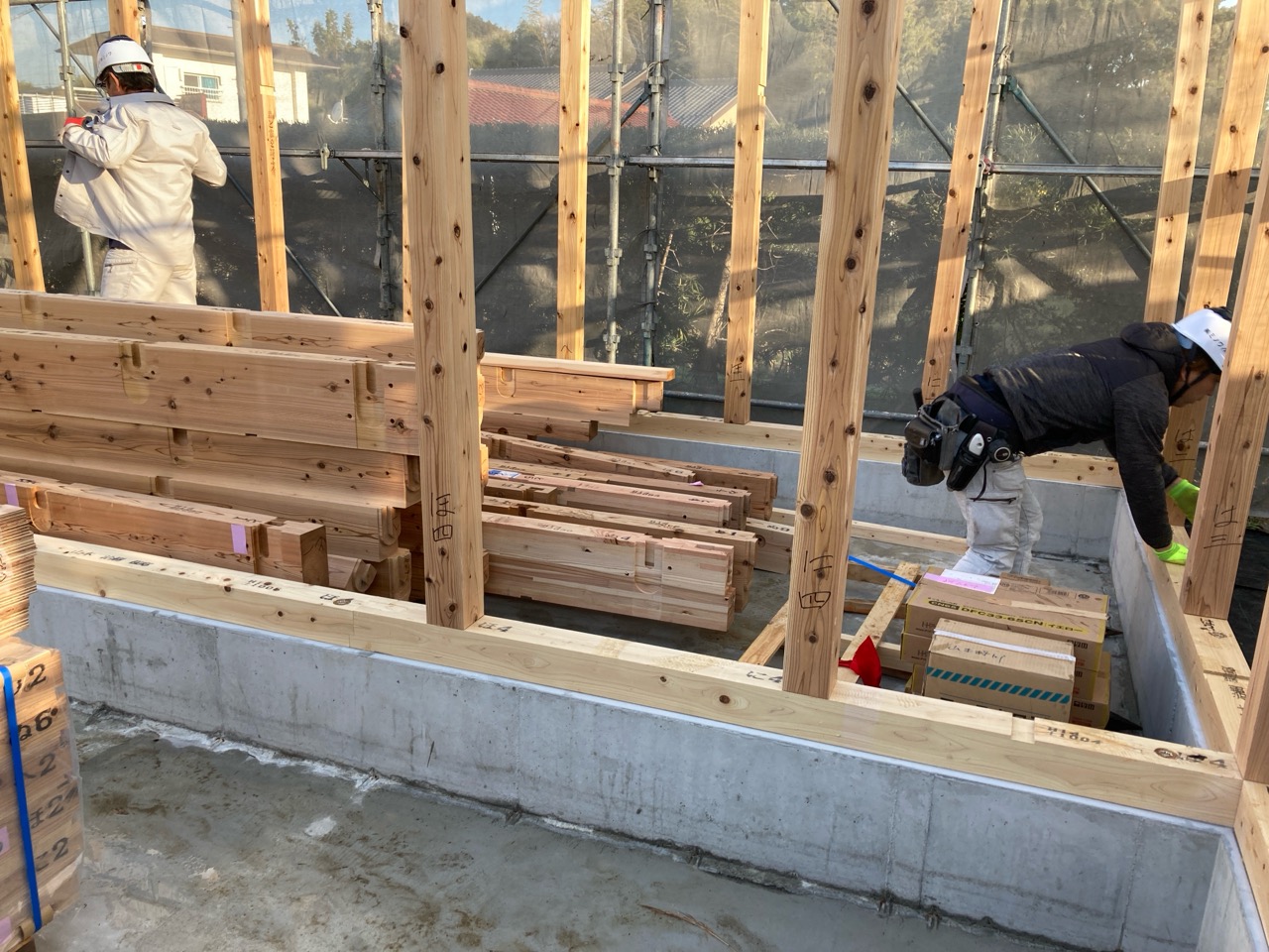 普段であれば土台や大引は床合板に隠れ、柱を建てる位置だけが切り抜かれている部分に柱を建てていくのですが、今回の仕様では床合板はだいぶ後になってから施工しますので、まずは柱だけを土台の上に立てていきます。設計のk長先生の地元、栃木県から運送された『八溝杉』の柱です。