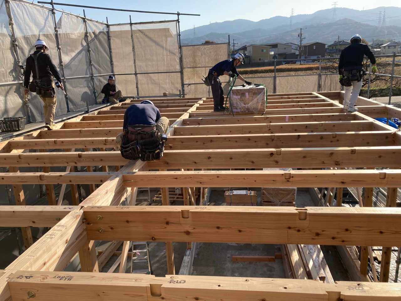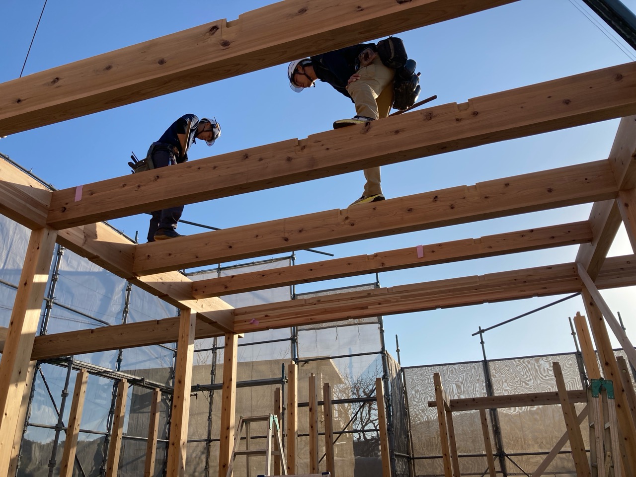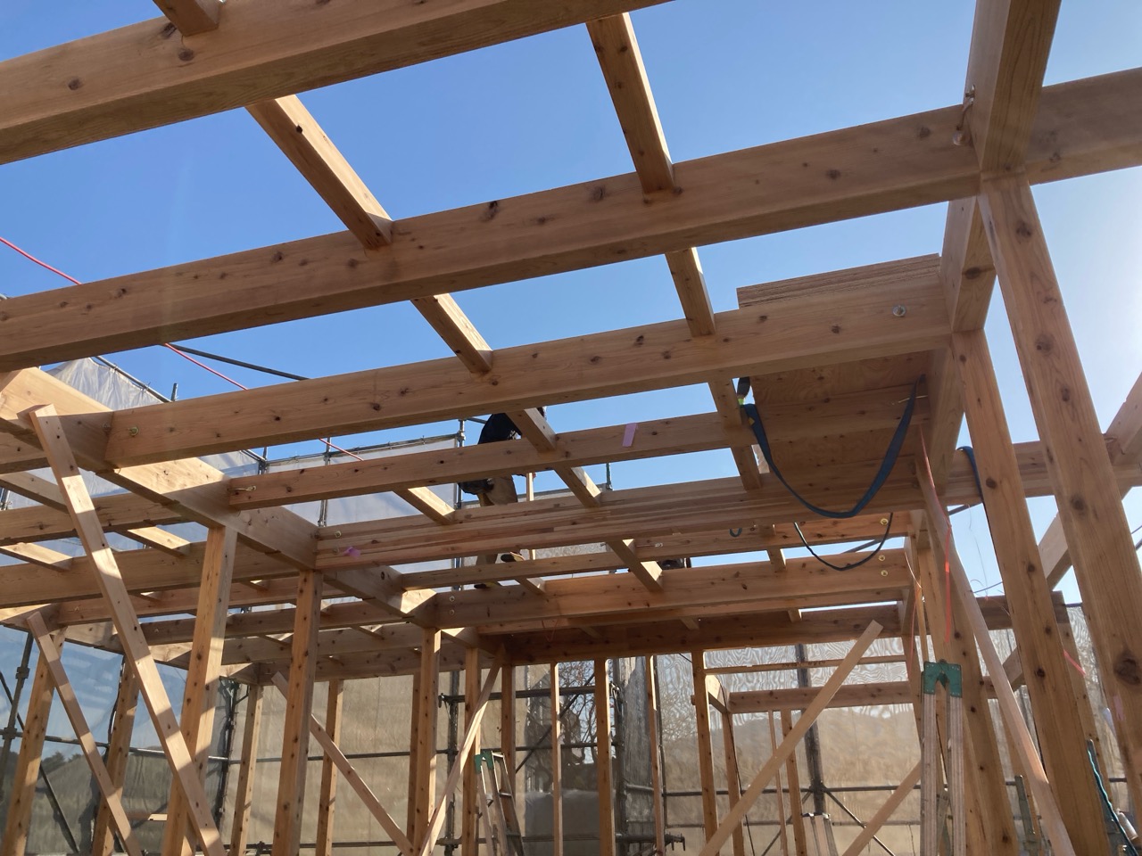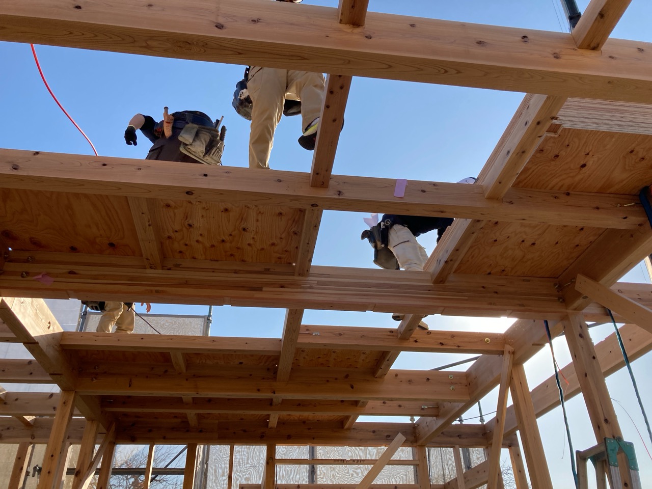 水平剛性を高めるための小屋組みの剛床ですが、それが敷設されるまでは格子組上の細い梁の上に乗っての作業です。大工さんたちはへっちゃらで歩いていきますが、筆者が乗れば足がすくんで1mも歩けません。