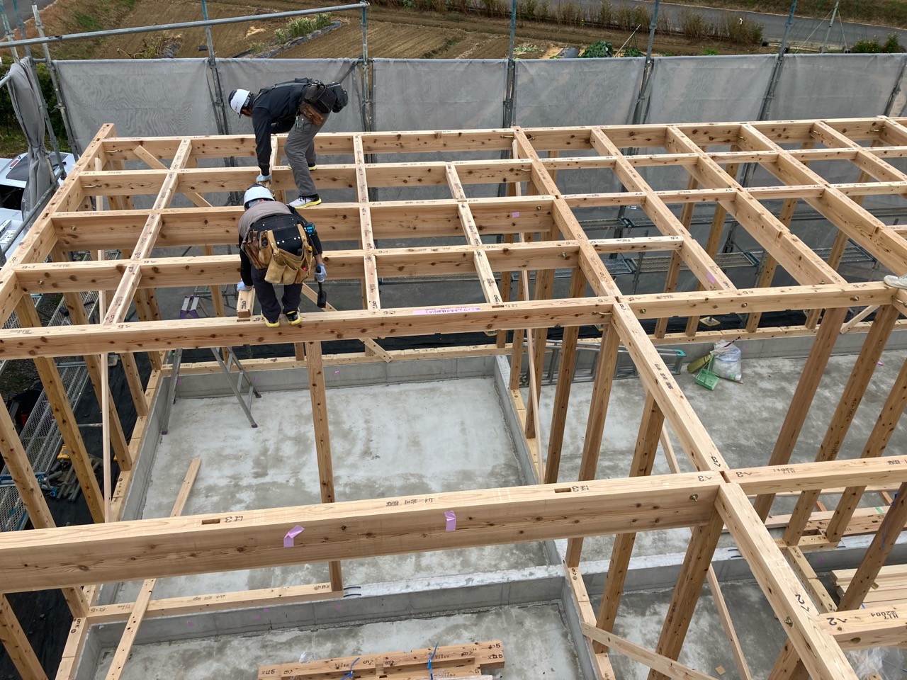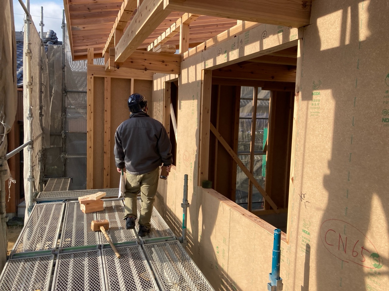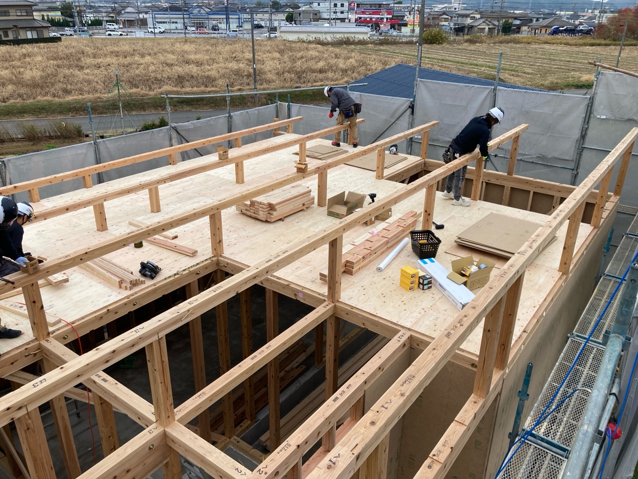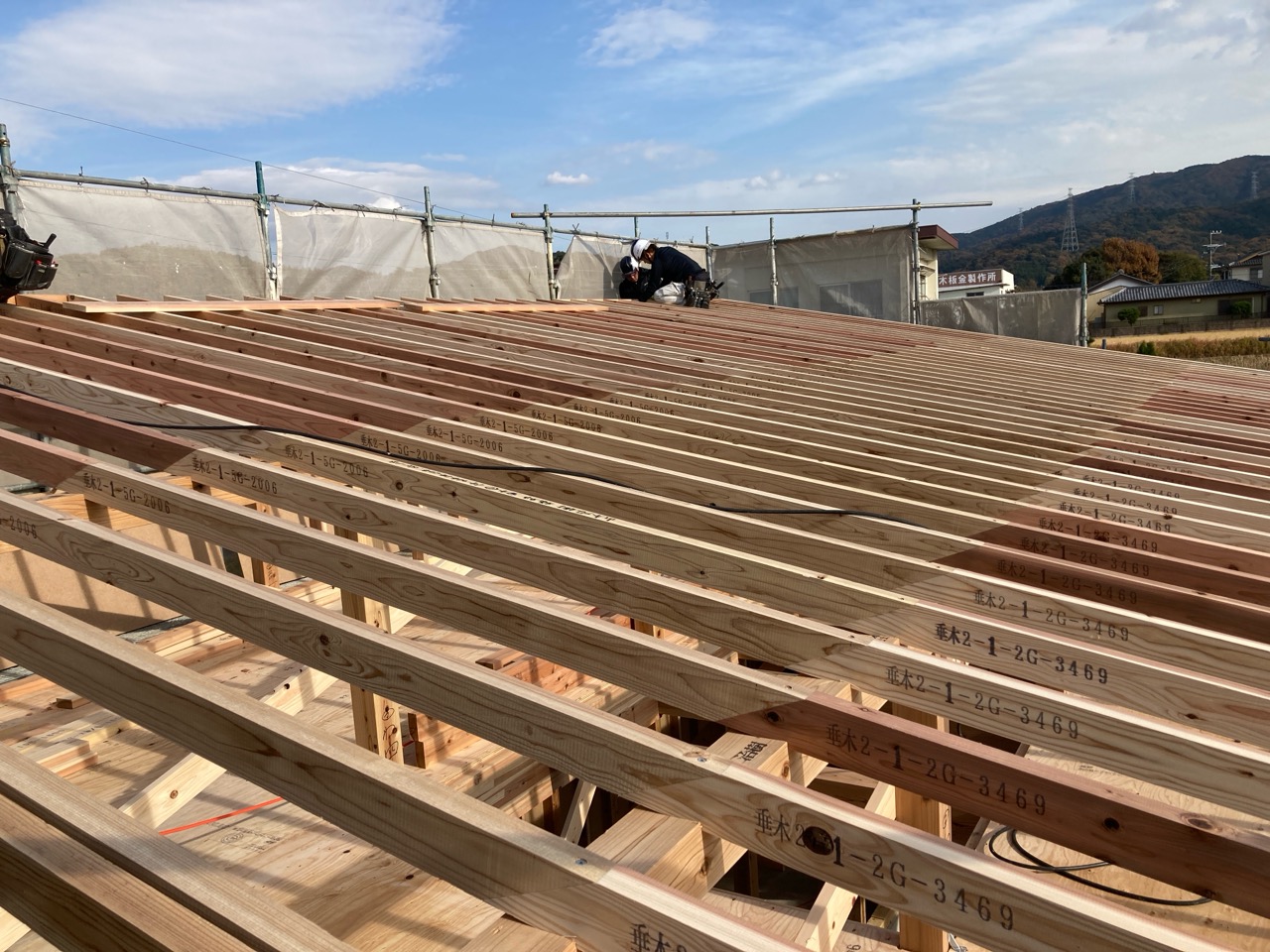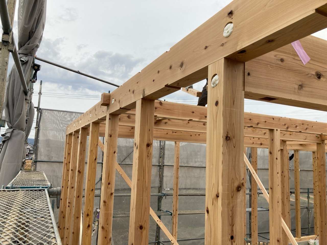 水平剛性を高めるための小屋組みの剛床ですが、それが敷設されるまでは格子組上の細い梁の上に乗っての作業です。大工さんたちはへっちゃらで歩いていきますが、筆者が乗れば足がすくんで1mも歩けません。