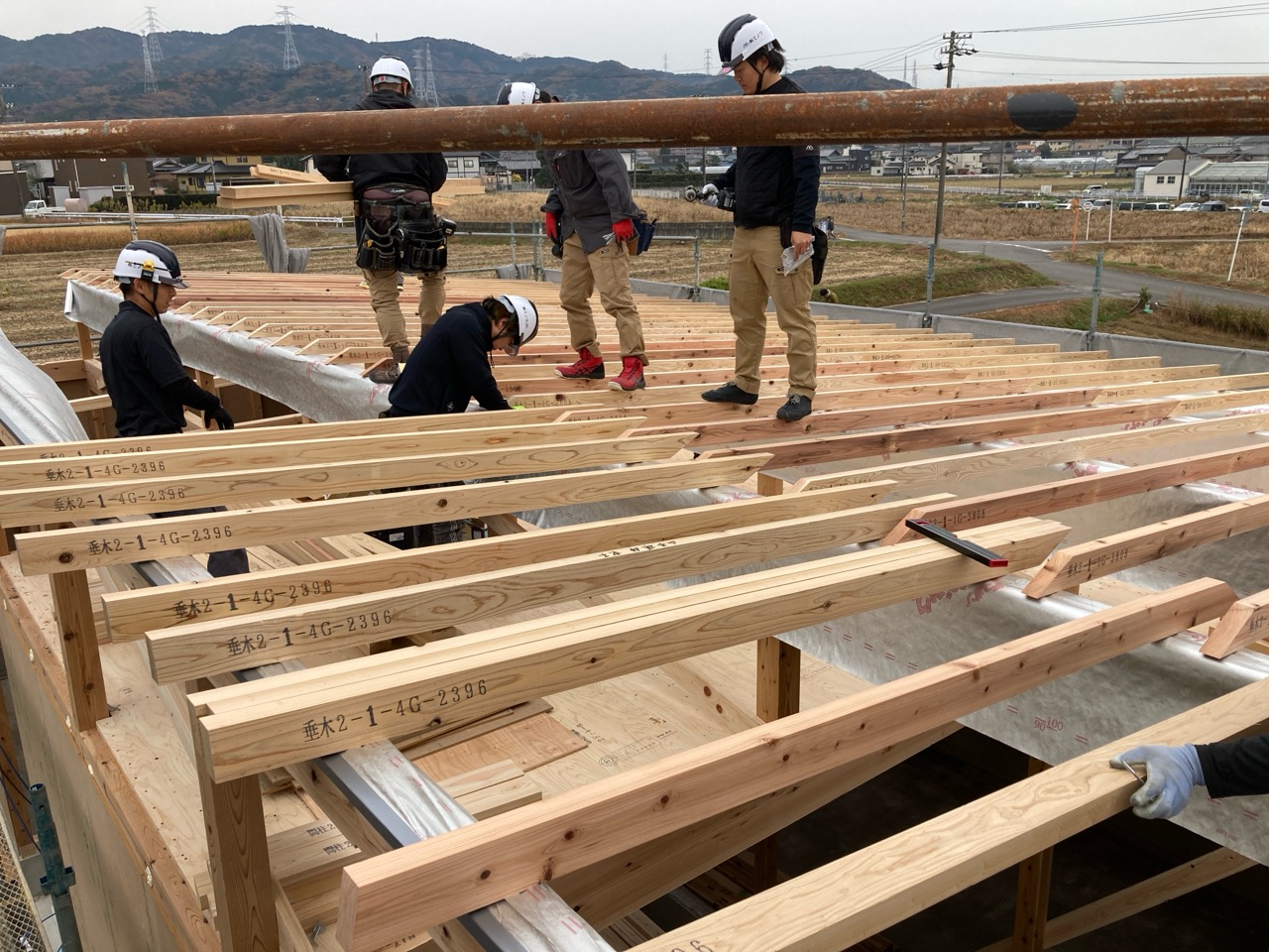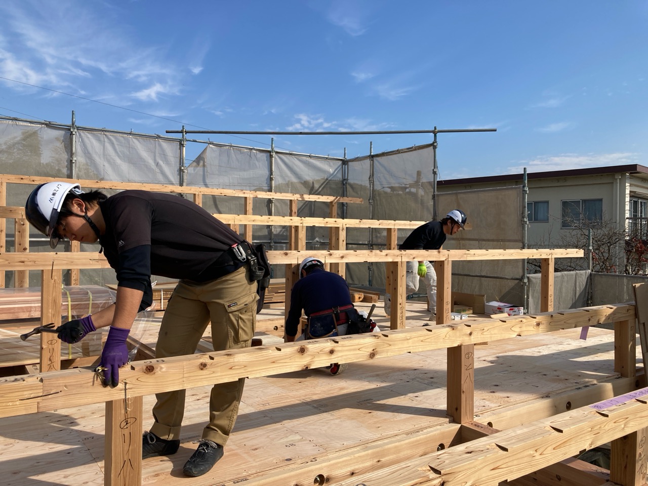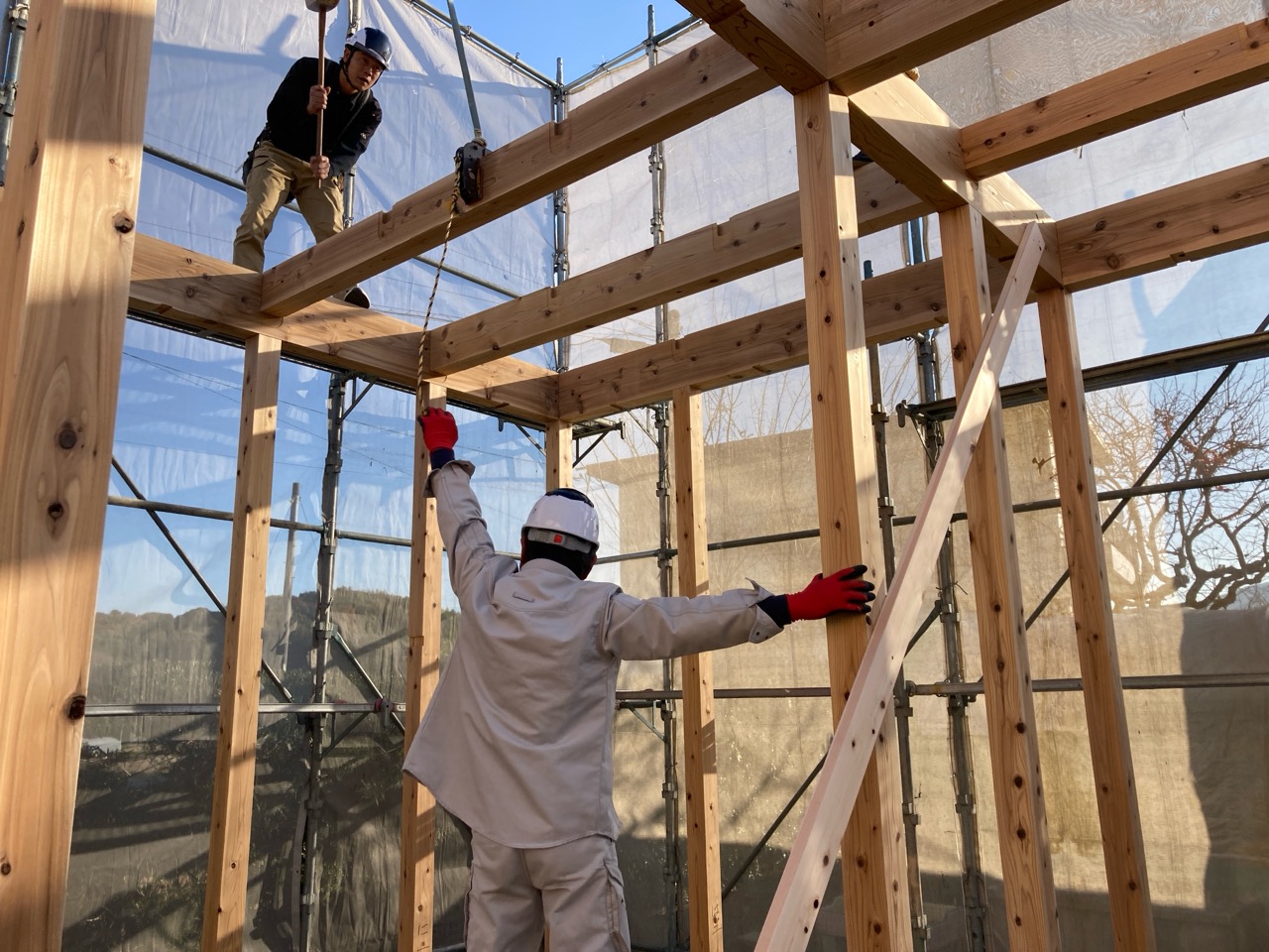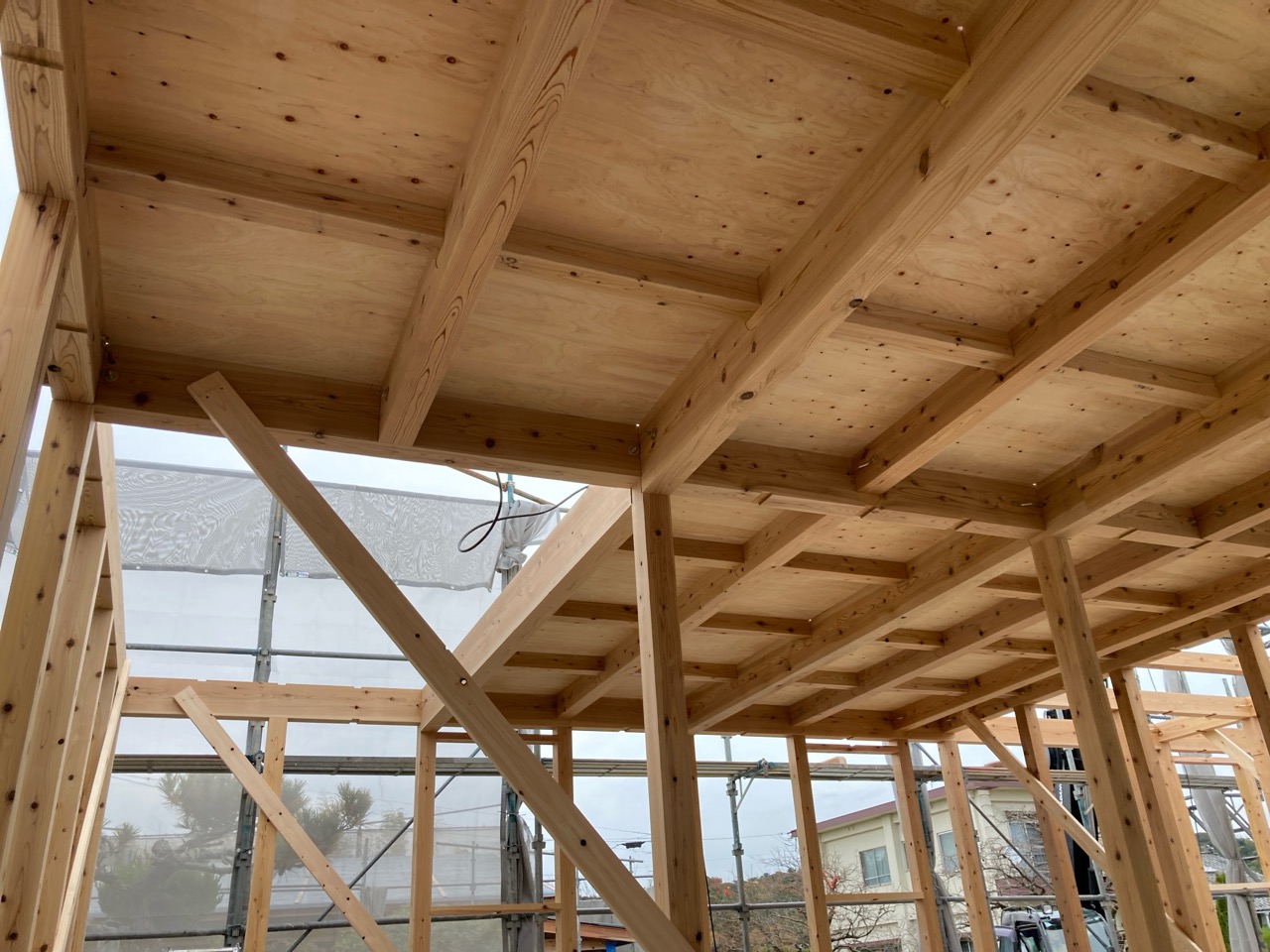 水平剛性を高めるための小屋組みの剛床ですが、それが敷設されるまでは格子組上の細い梁の上に乗っての作業です。大工さんたちはへっちゃらで歩いていきますが、筆者が乗れば足がすくんで1mも歩けません。