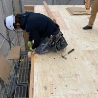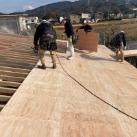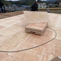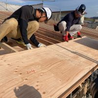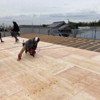 午後の部スタート。午前中までに垂木を終えていましたので残っているのは屋根合板と防水シート張りです。屋根勾配は北世帯の二寸勾配よりさらに緩やかな一寸勾配。屋根の形も完全に整形ですので作業しやすく、複雑でなく、これ以上なくありがたい形状です。