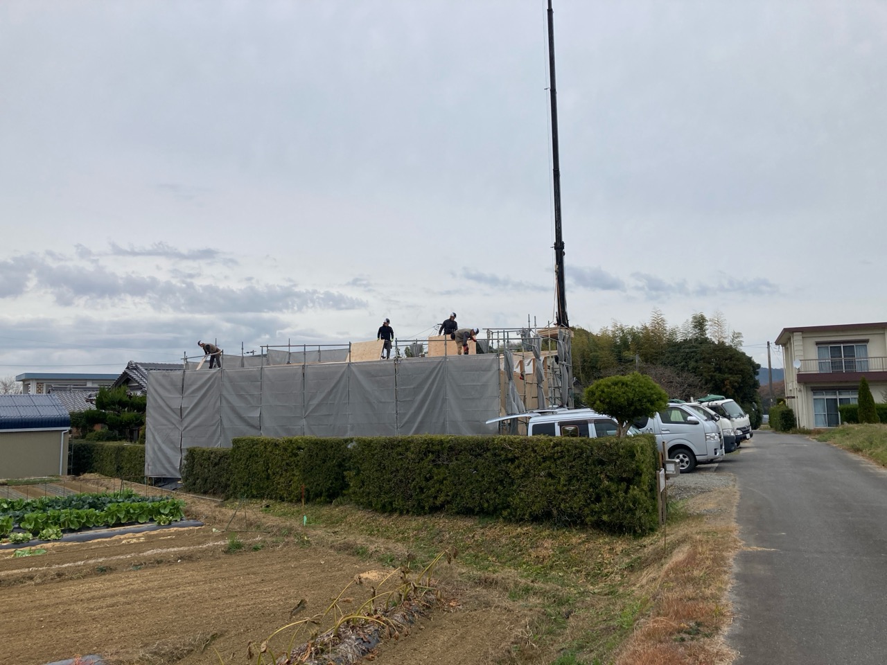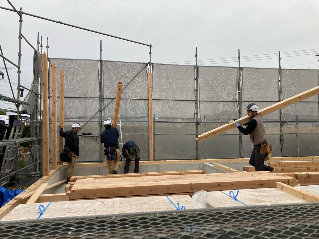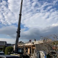 先週の北世帯に引き続き、今度は南世帯の上棟日を迎えました。先週からの予報では雨模様が心配されていましたが、空一面の曇天の割には雨粒ひとつ降らず、気温も先週の快晴より今日の方が暖かいのでは?という作業のしやすい日となりました。