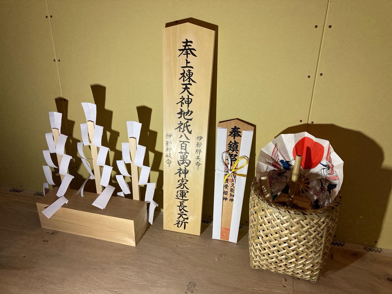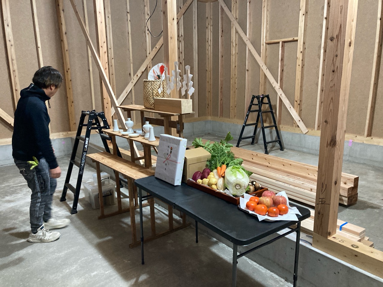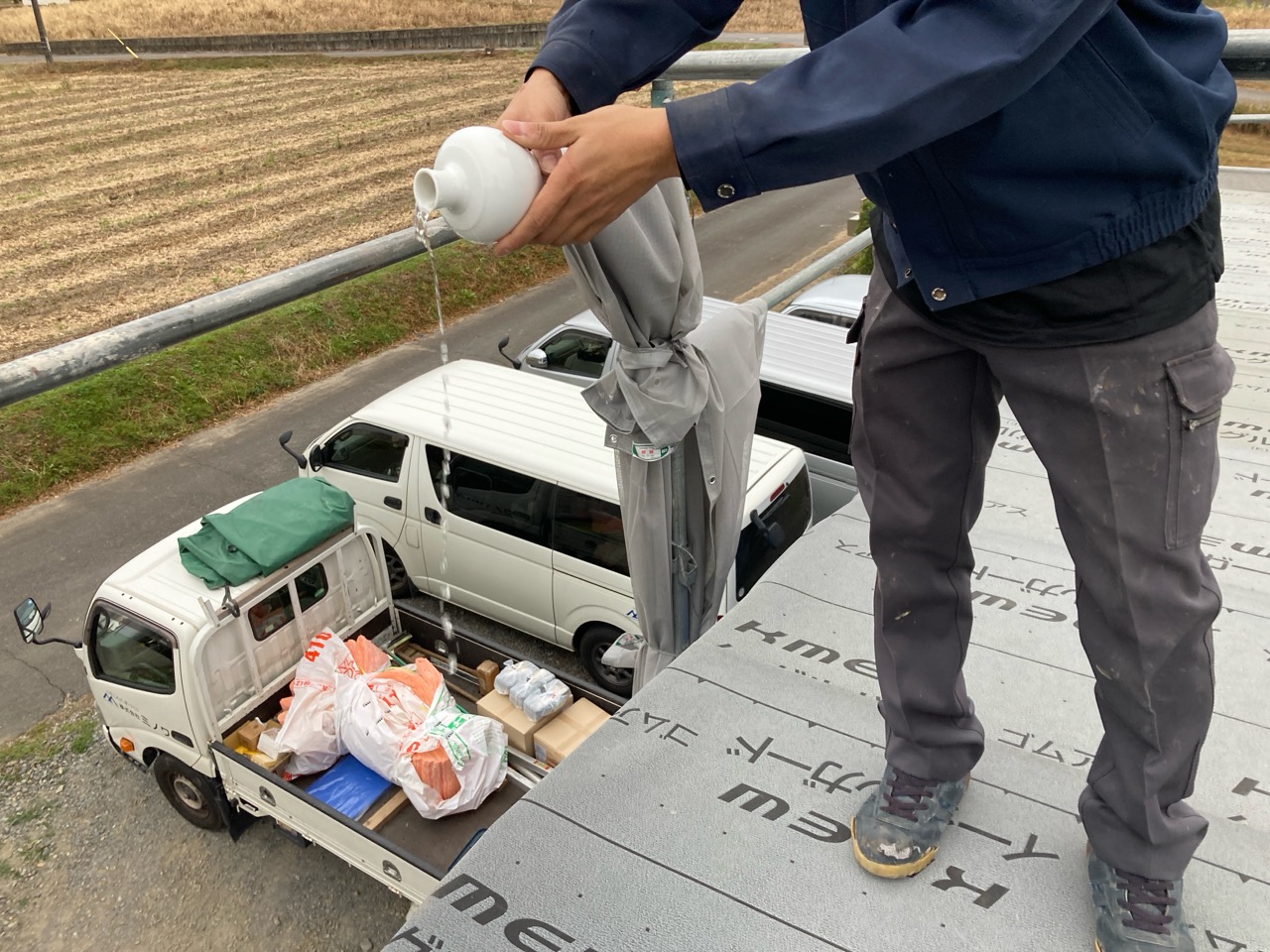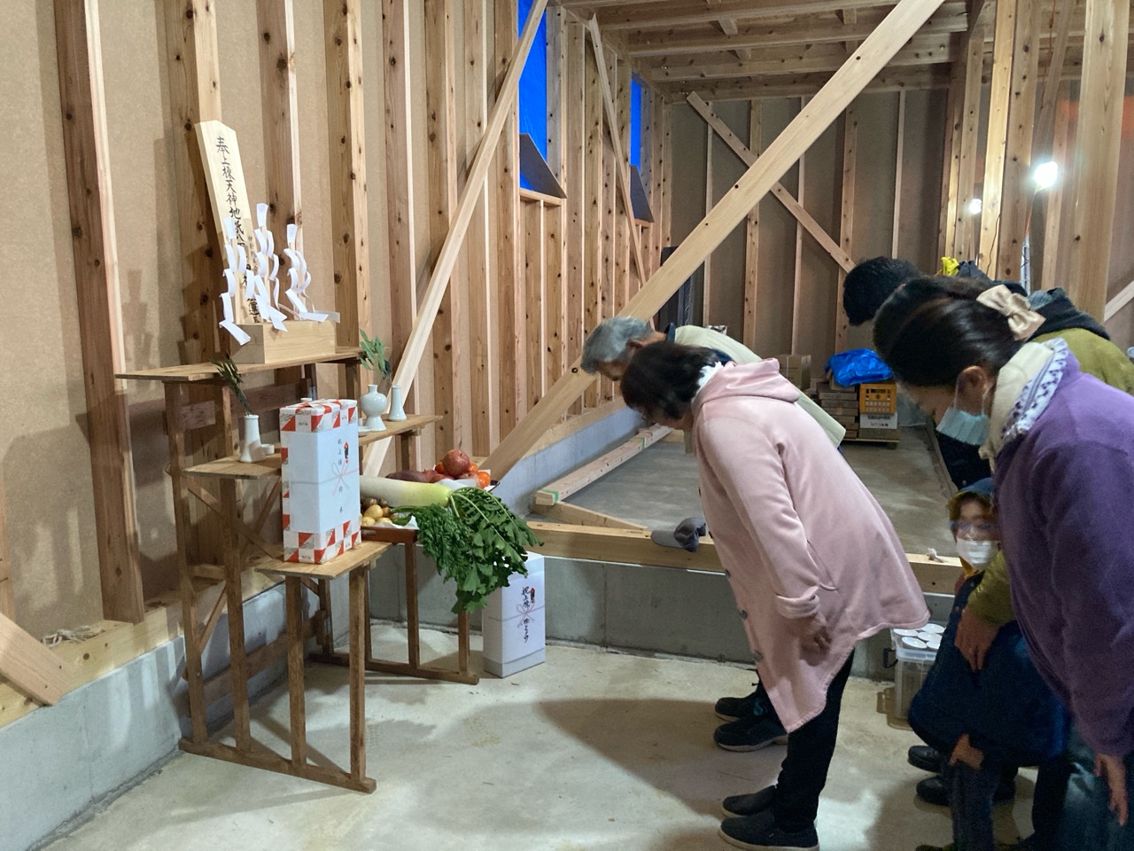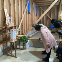 この時期にまだ明るい内に上棟式までできる(先週もそんな事を言っていましたが)のはかなりのペースと言って良いでしょう。いそいそと祭壇の準備をし、屋根の上から棟梁がお神酒、監督が塩をもってお清めに回りました。