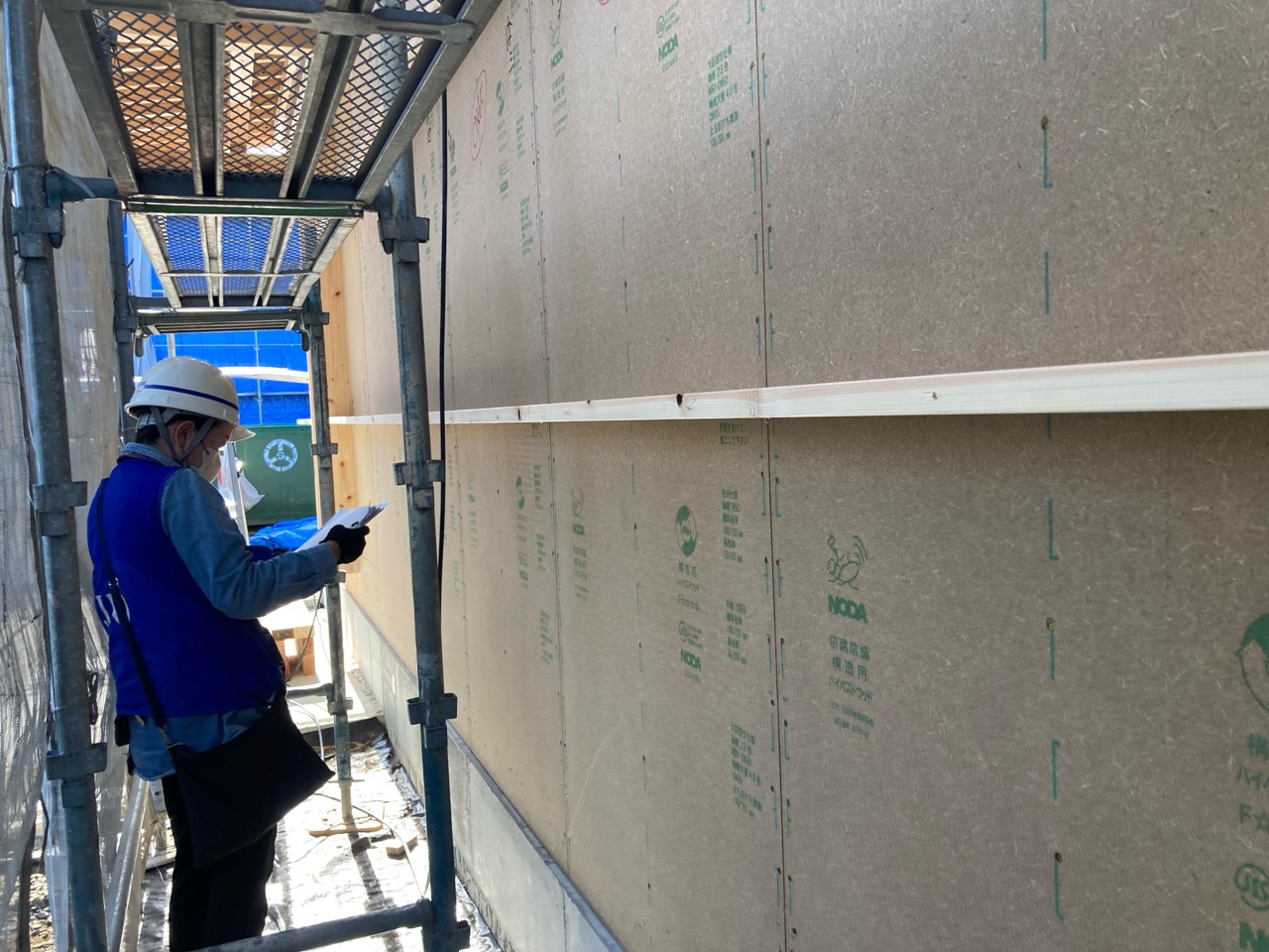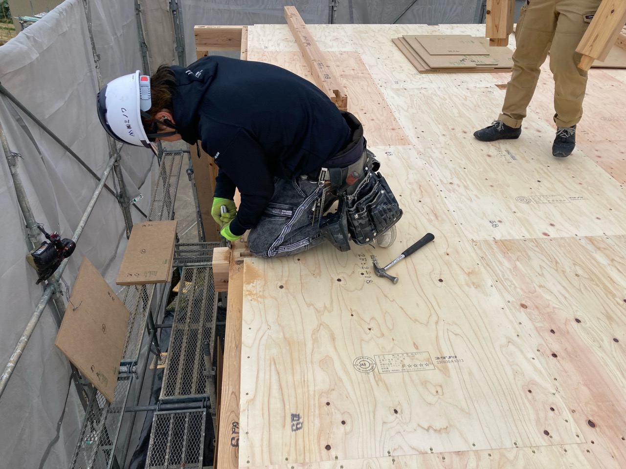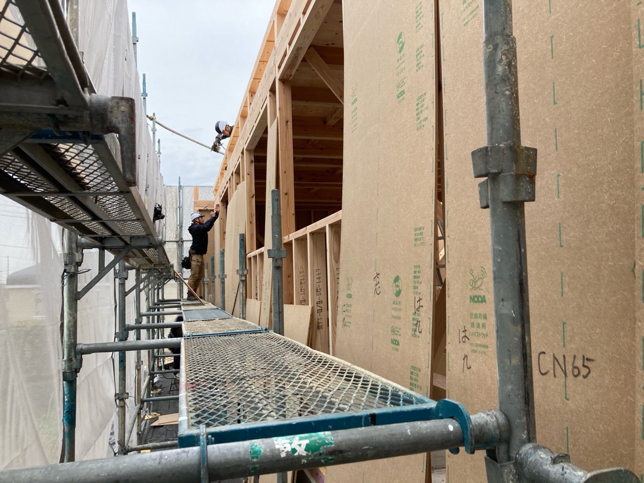 ある程度軸組ができたら外壁の耐力面材を並べていきます。今回は木質系の『ハイベストウッド』を使用。耐力面材としては軽く、作業しやすい材料です。また、数ある面材の中でも釘の打ち方、種類によって、4.0倍、4.3倍まで取れる優れた面材です。