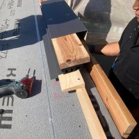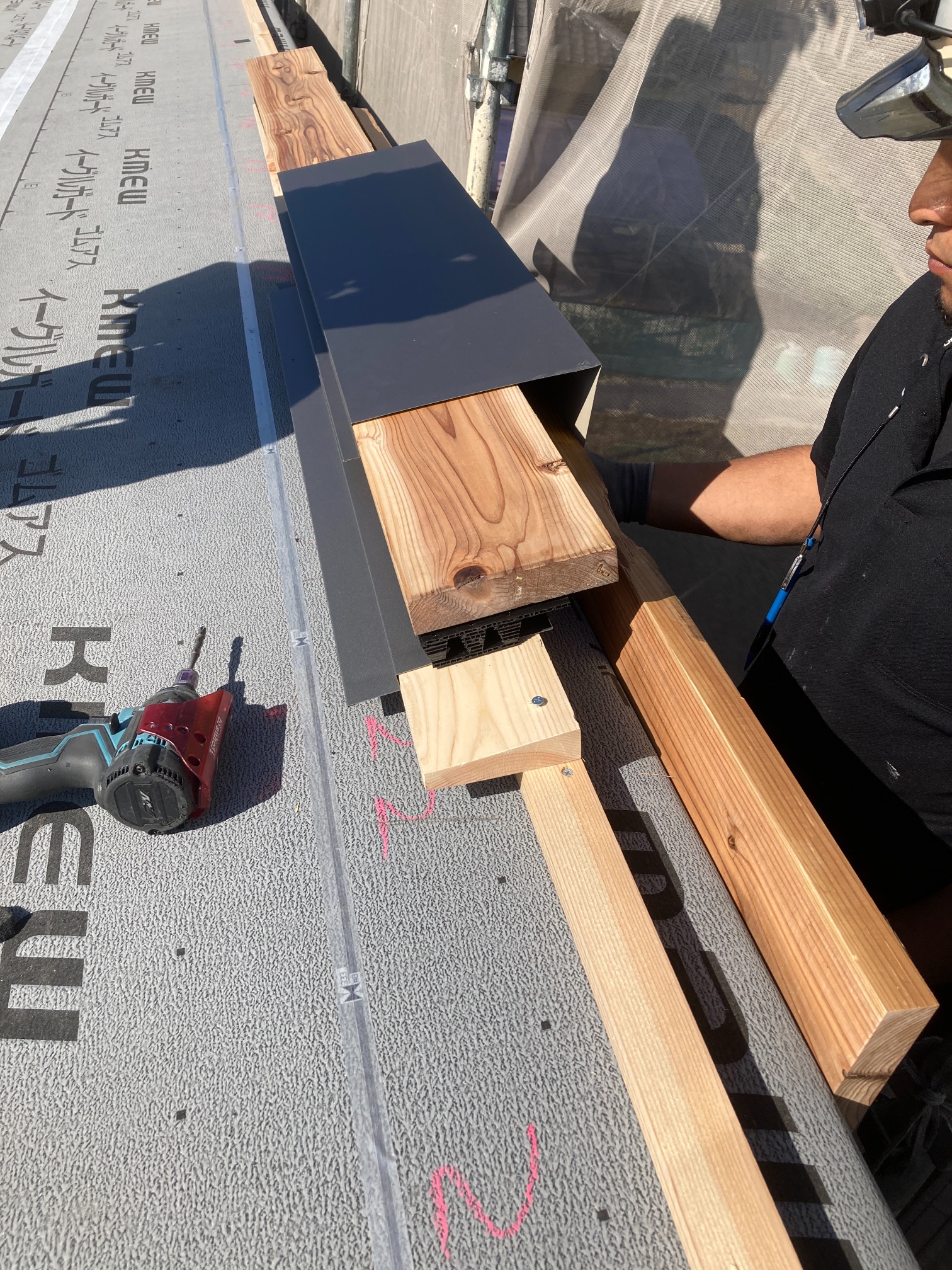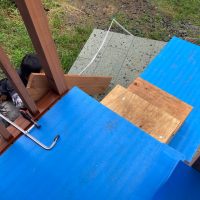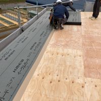 午後の部開始。といっても残るは屋根合板と雨仕舞のみ。屋根勾配も緩く、片流れの整形の屋根ですので、かなりスムーズに進んでいきます。