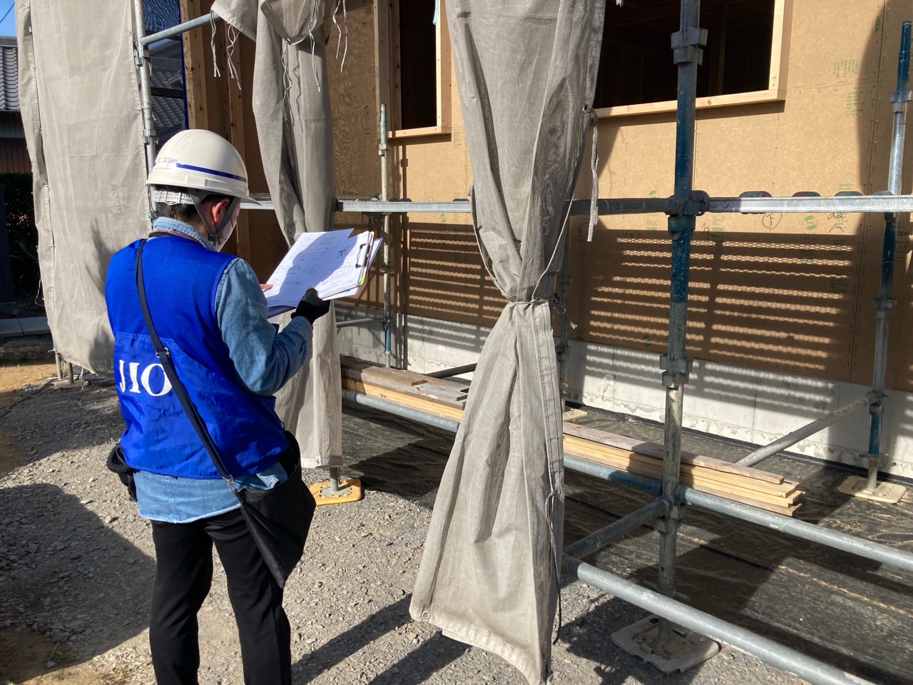 本日はJIOによる中間検査として、建築構造金物や耐力面材の検査を受けています。検査に立ち会うために昨日の上棟に引き続き今日も現場にやって来ました。ミノワのある江南市まで一度帰るのはもったいないと考え、隣の岡崎市にも別件の用があったため、昨夜は幸田町の宿舎に転がり込み一泊。時間的にも余裕をもって行動する事ができました。
