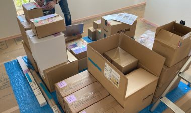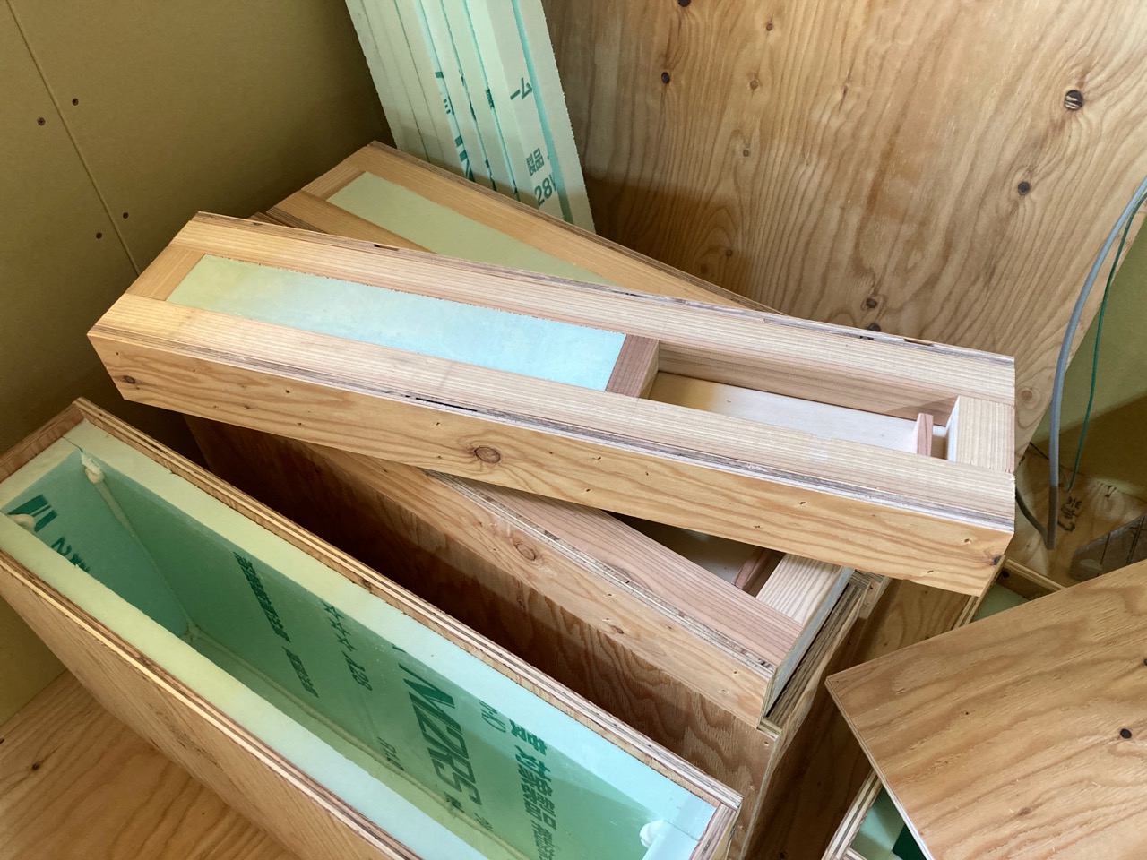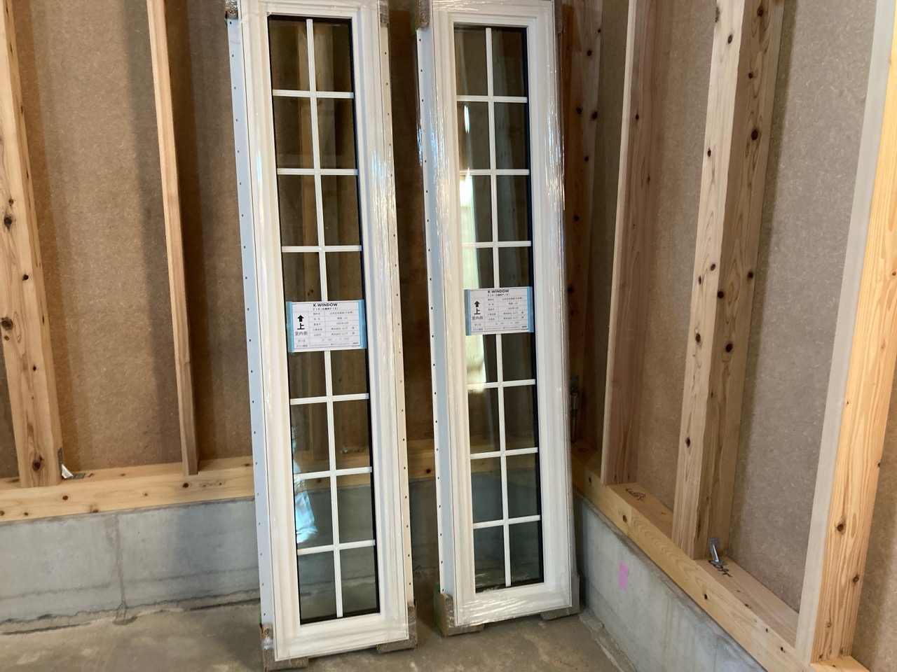 神奈川県のメーカーからサッシが到着。遠路はるばるご苦労様です。温熱環境計算の外皮計算と日射取得計算により開口部の面積が設計されていますので比較的小ぶりなサッシが多い印象です。