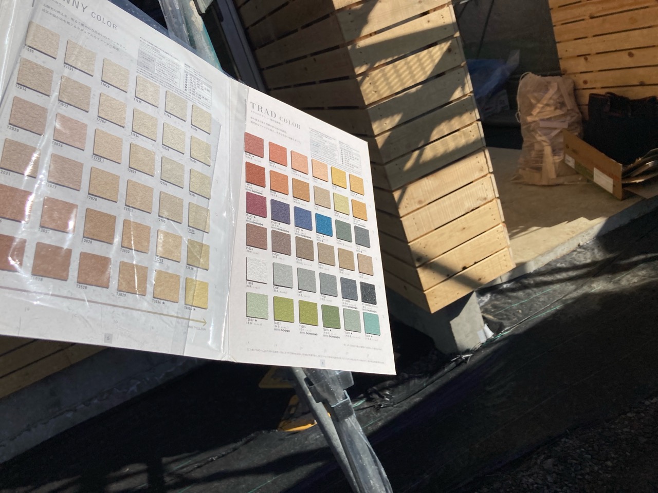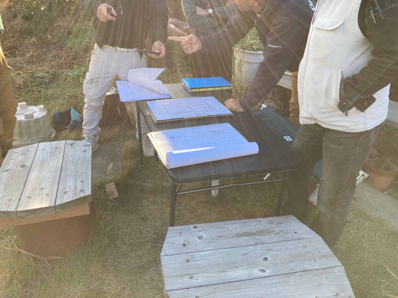 そんな作業の合間にも庭先でテーブルを広げて電気配線のお打ち合せを行いました。12月とは言え陽射しが暖かく風も無いので厚着をしていると少し暑いくらいの陽気でした。