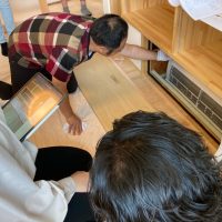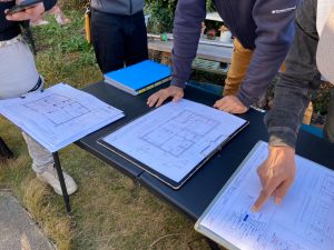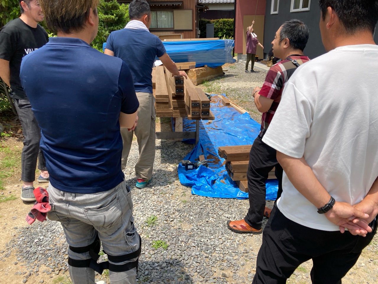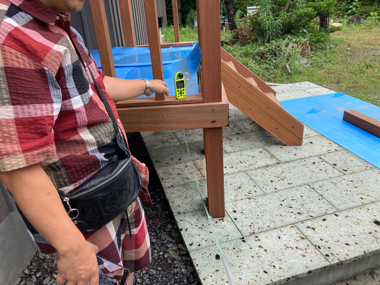 到着もつかの間、まずは北世帯で組んでいるウッドデッキの材料に興味津々。普段なかなか使用しない材料や収まりに一番に目が行くあたりはさすがです。