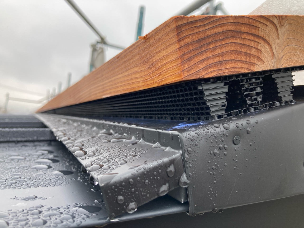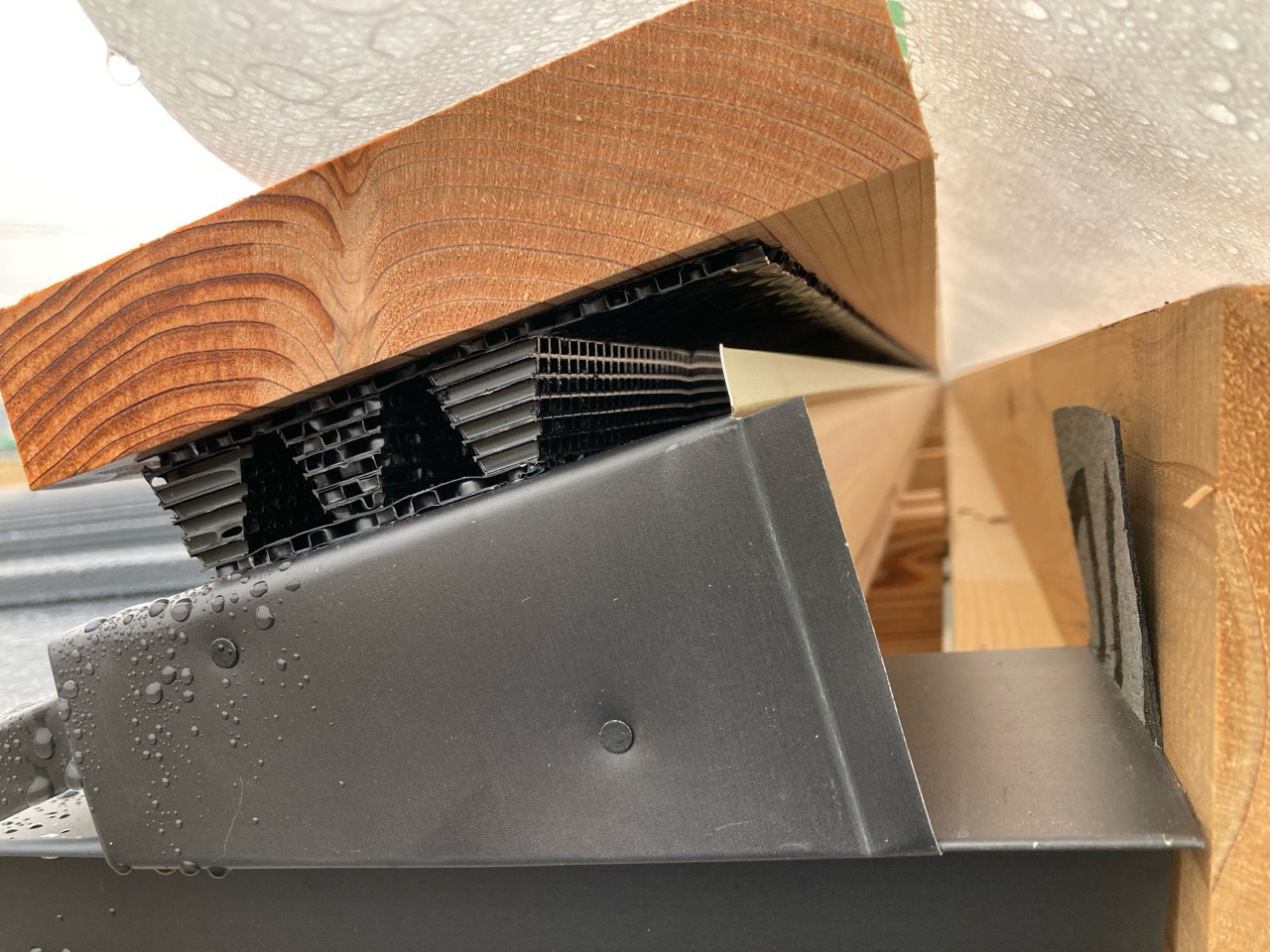 屋根の棟の収まりをサンプルを使って検証。今回の屋根は片流れですので『棟』と言うのは違っているかもしれませんが、一番水上側の収まりは小屋裏の換気を抜きつつ、雨水が侵入しないようにk長先生によって考えられています。