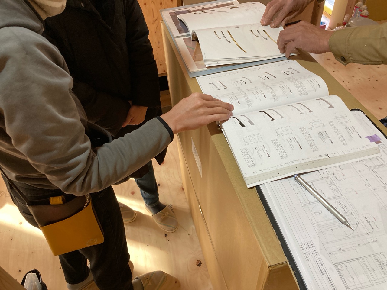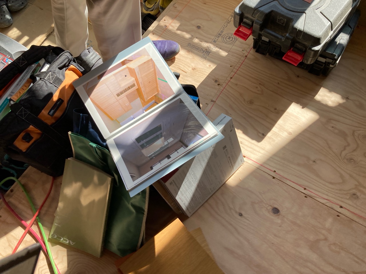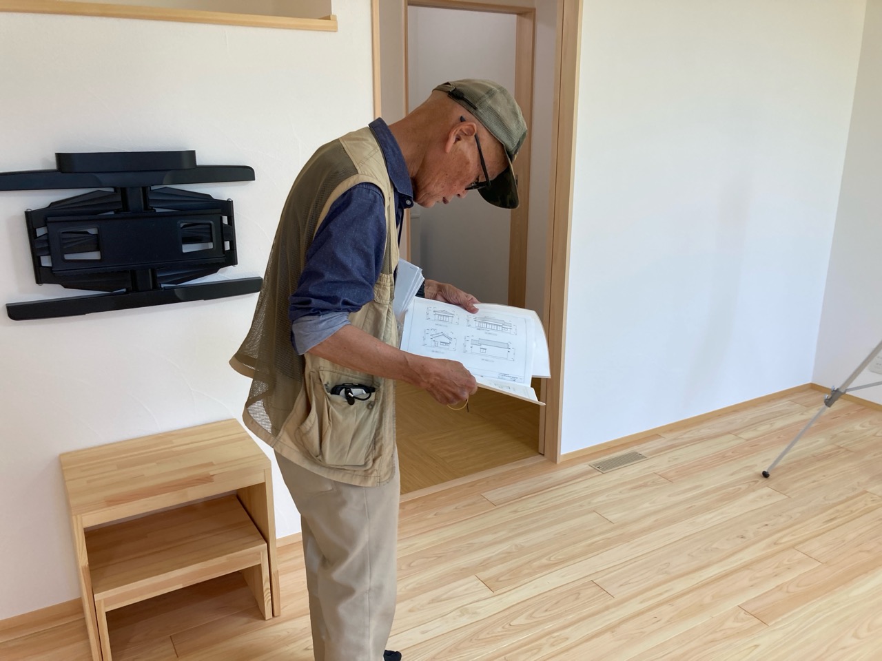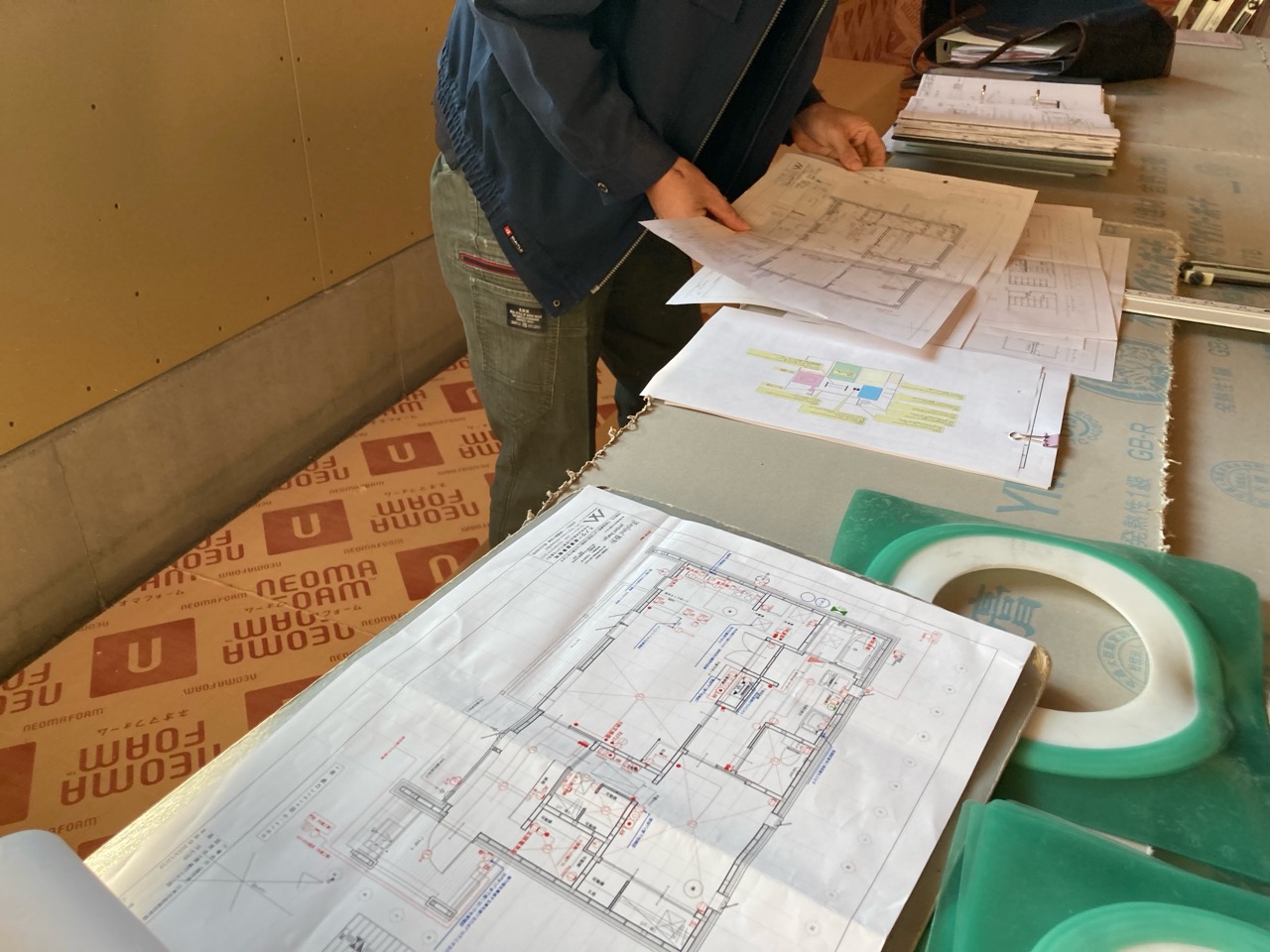この日の為にk長先生も栃木県から再び来場。現場の各所と図面を照らし合わせながらチェックして回ります。そうこうしている間にも地元の現場からはジャンジャンと電話がかかってきます。先生の仕事の忙しさがうかがえます。