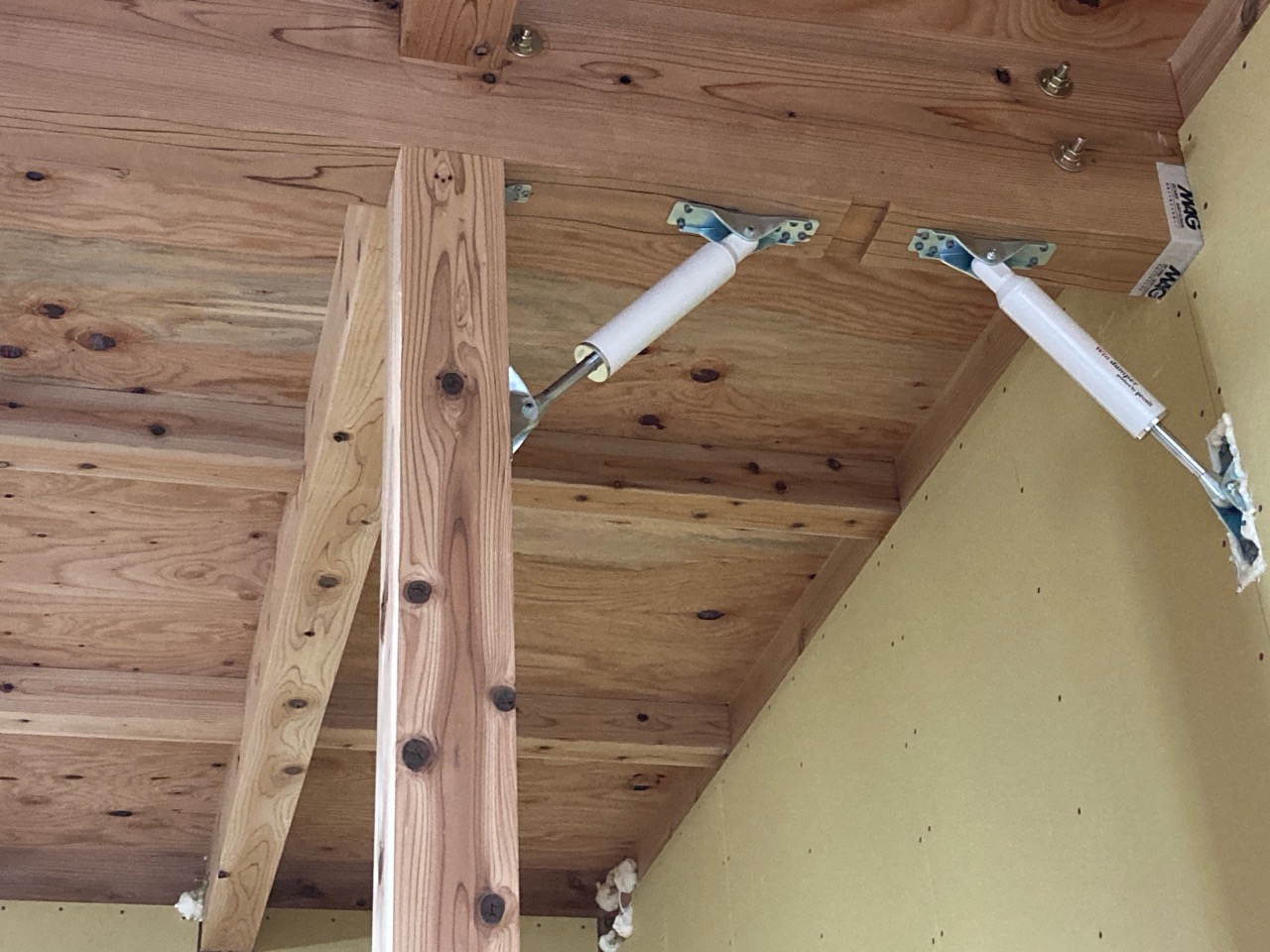 レッカーで梁を持ち上げる際に使用する『ツカミ』と呼ばれる道具。梁を設置した後、横についている紐を引っ張れば外れる便利な道具です。床合板が無いので紐に届くまで台に乗って目いっぱい背を伸ばして引っ張ります。こんな部分にも普段と違う高さ感覚が出てきます。