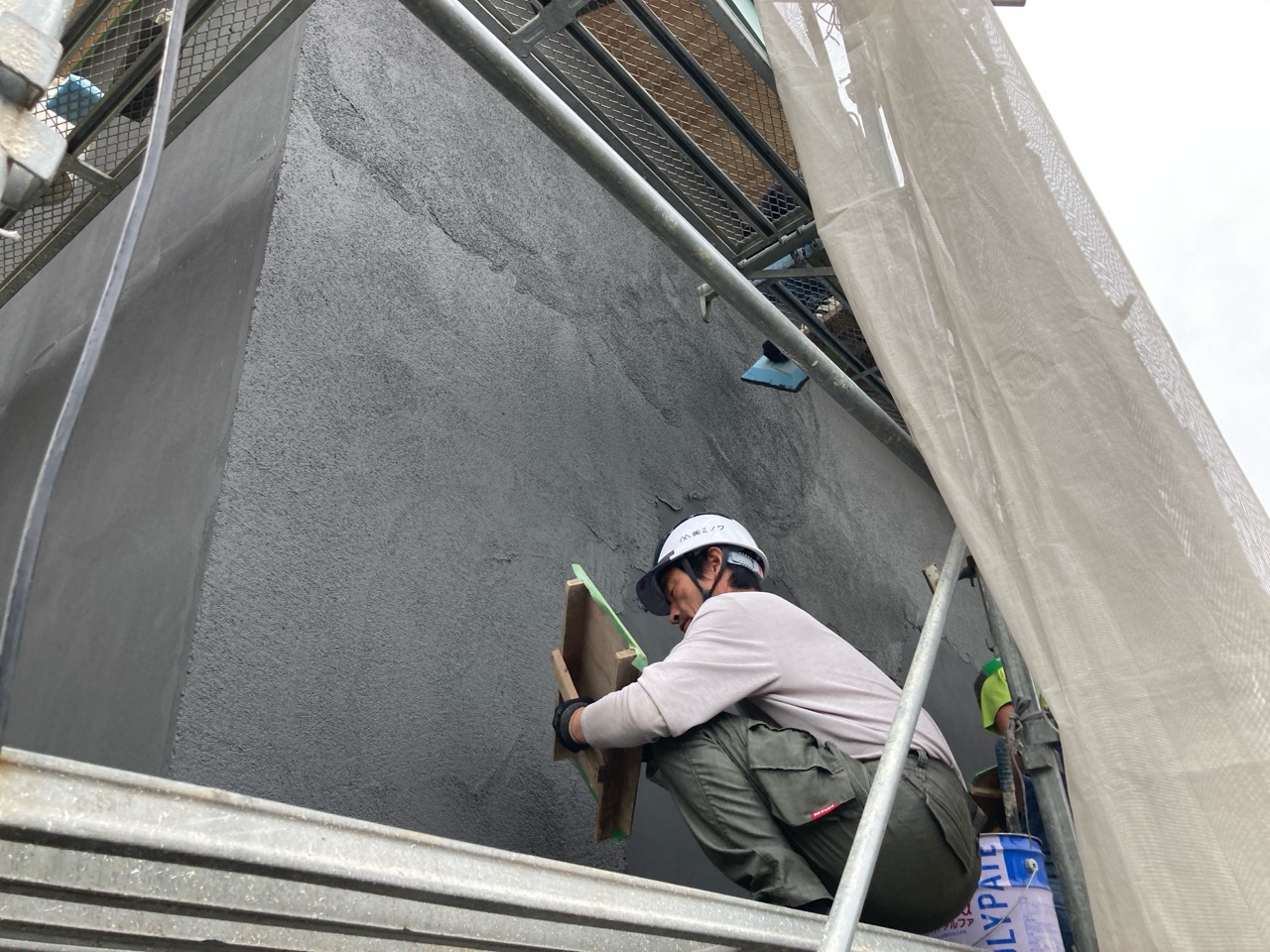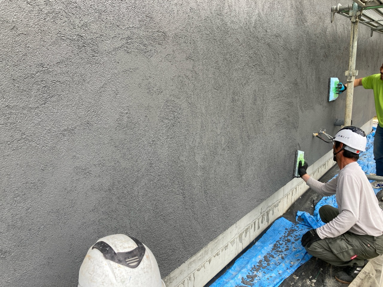 打設班が北世帯の打設を行っている間、コテ押え班は南世帯の土間を均していきます。