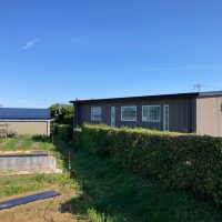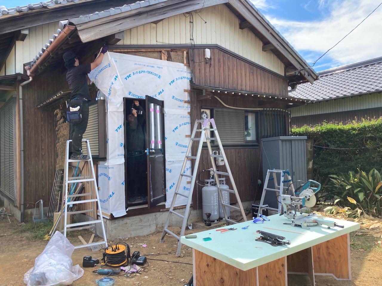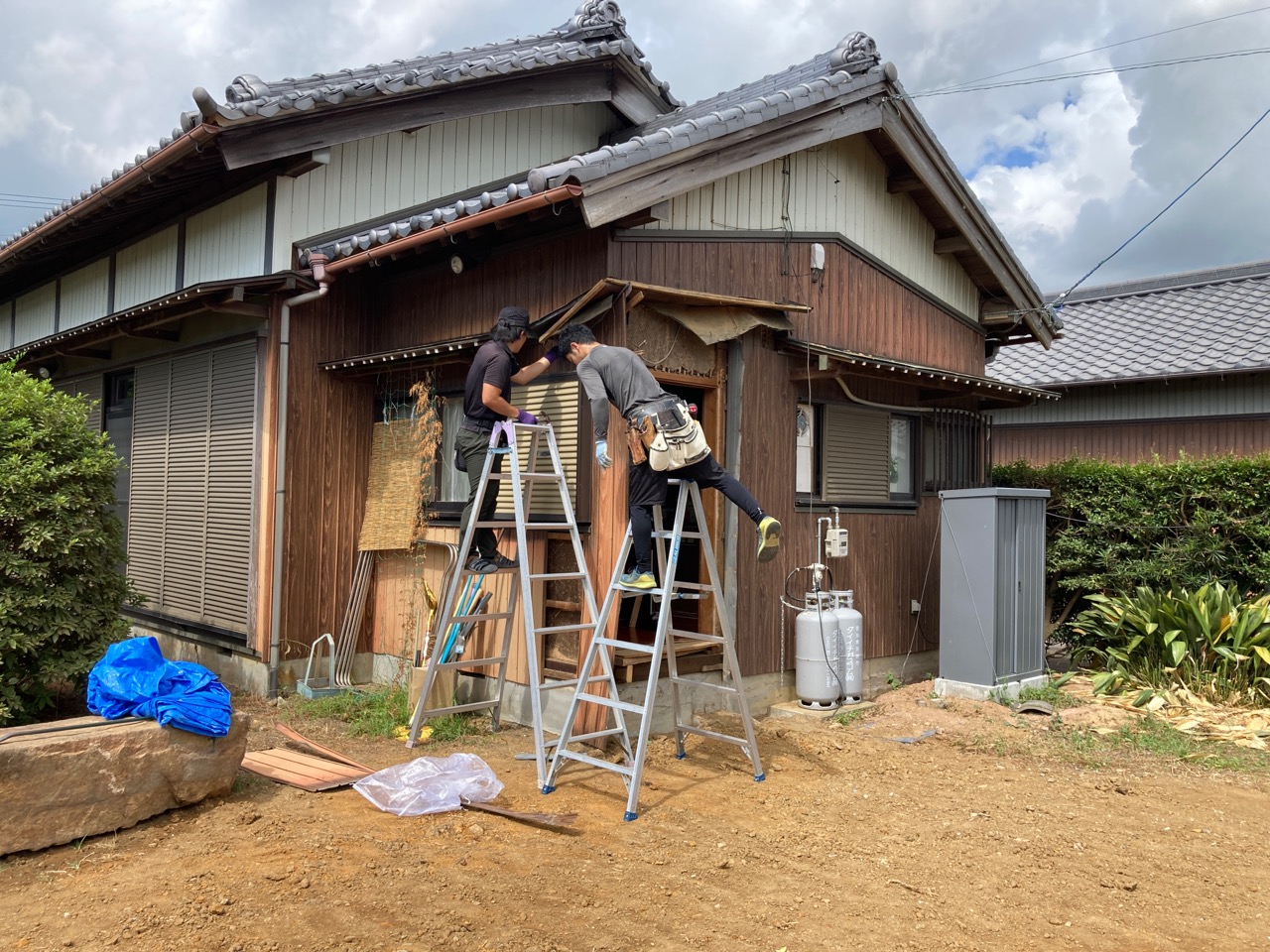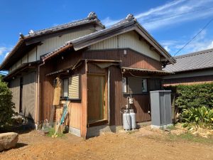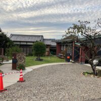 解体工事を終えて元々の主屋がキレイサッパリなくなりました。南西に立つ離れと渡り廊下でつながっていた部分は簡易な養生がされていますが、本日はこの部分を修繕にやって来ました。