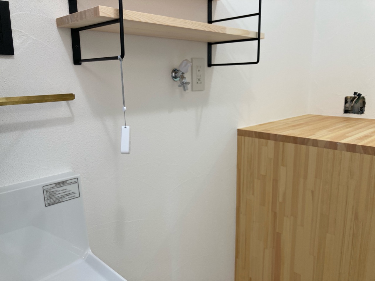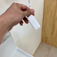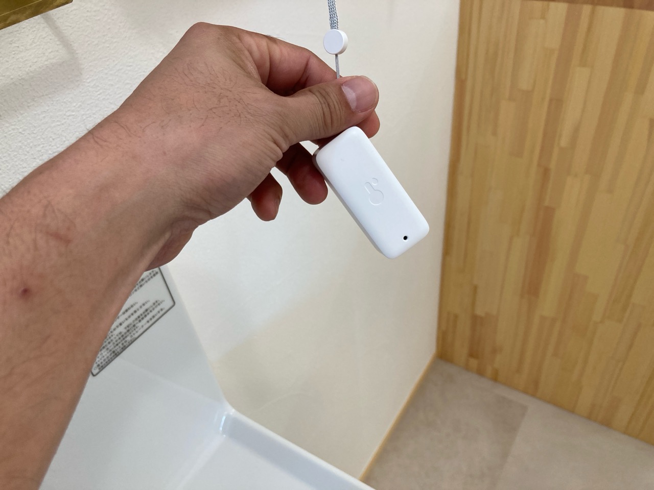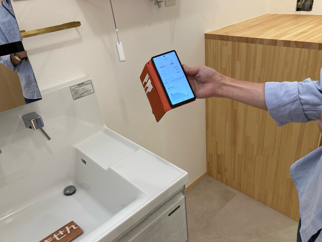 洗面室の棚ブラケットの一角に下げられたこちらの器具、実はy様が設置された温湿度計だそうです。Wi-Fiでスマートフォンに温湿度データを送信し遠隔で確認できるスグレモノ。