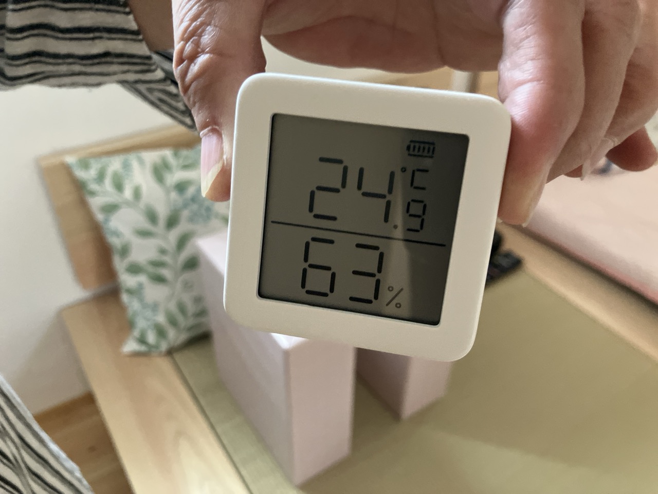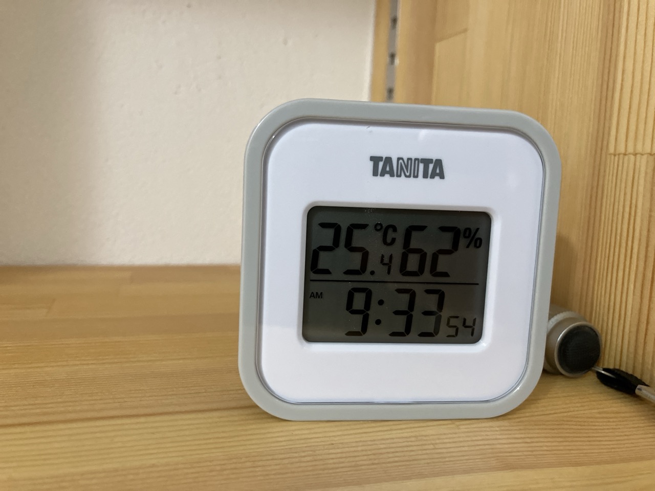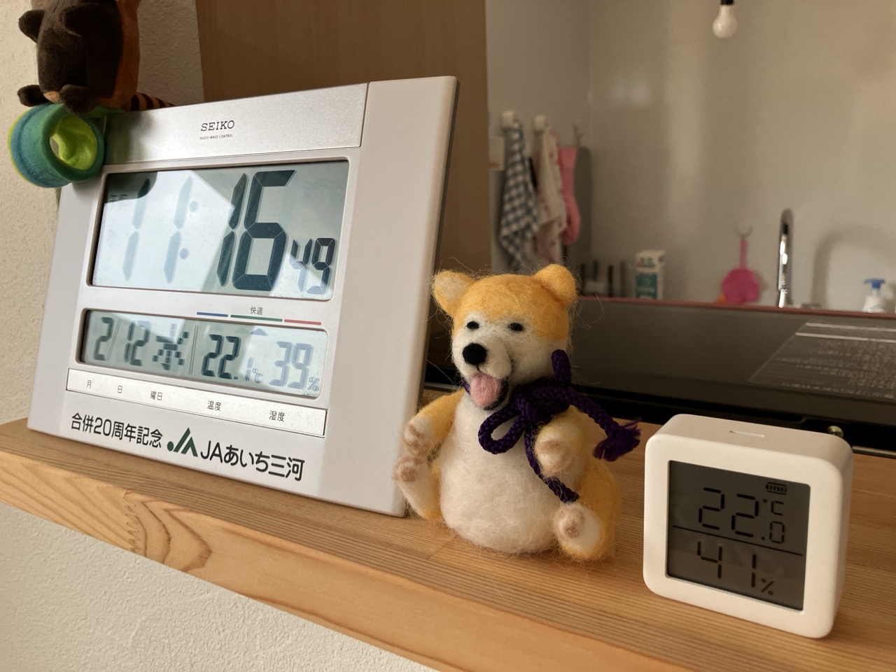 洗面室の棚ブラケットの一角に下げられたこちらの器具、実はy様が設置された温湿度計だそうです。Wi-Fiでスマートフォンに温湿度データを送信し遠隔で確認できるスグレモノ。