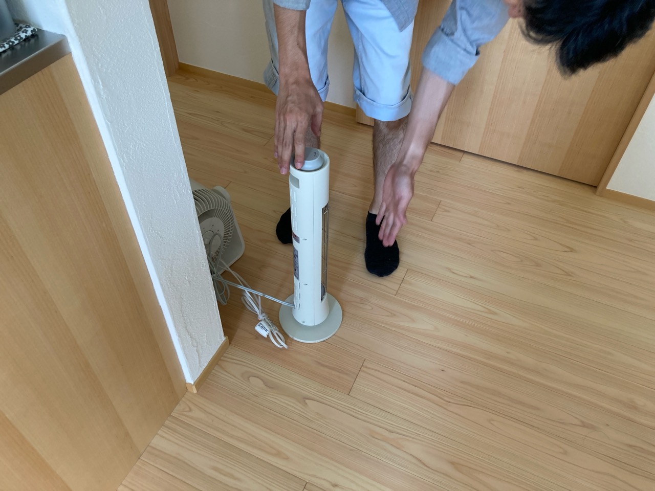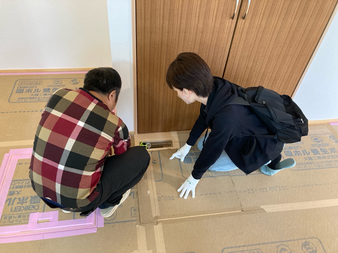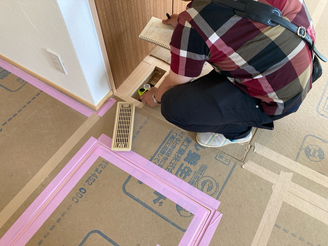引戸下部の隙間にティッシュペーパーをあてて気流の流れをチェック。床に空いた吹き出し口を開閉した時の流れを目視できるようにしました。