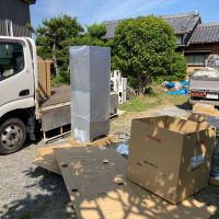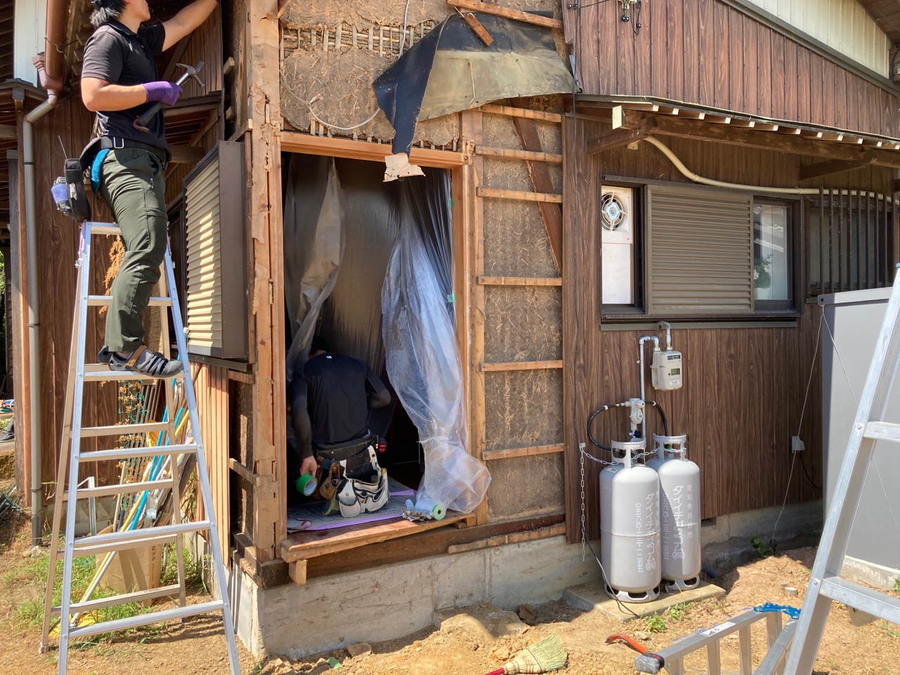 早速作業開始。接続されていた部分の外壁の板金を剥がしにかかります。この当時(昭和50年代)ではまだポピュラーであった土壁が下から現れました。新築に携わる予定のk保木棟梁と若手のo本君が手伝って次々と剝がされていきます。