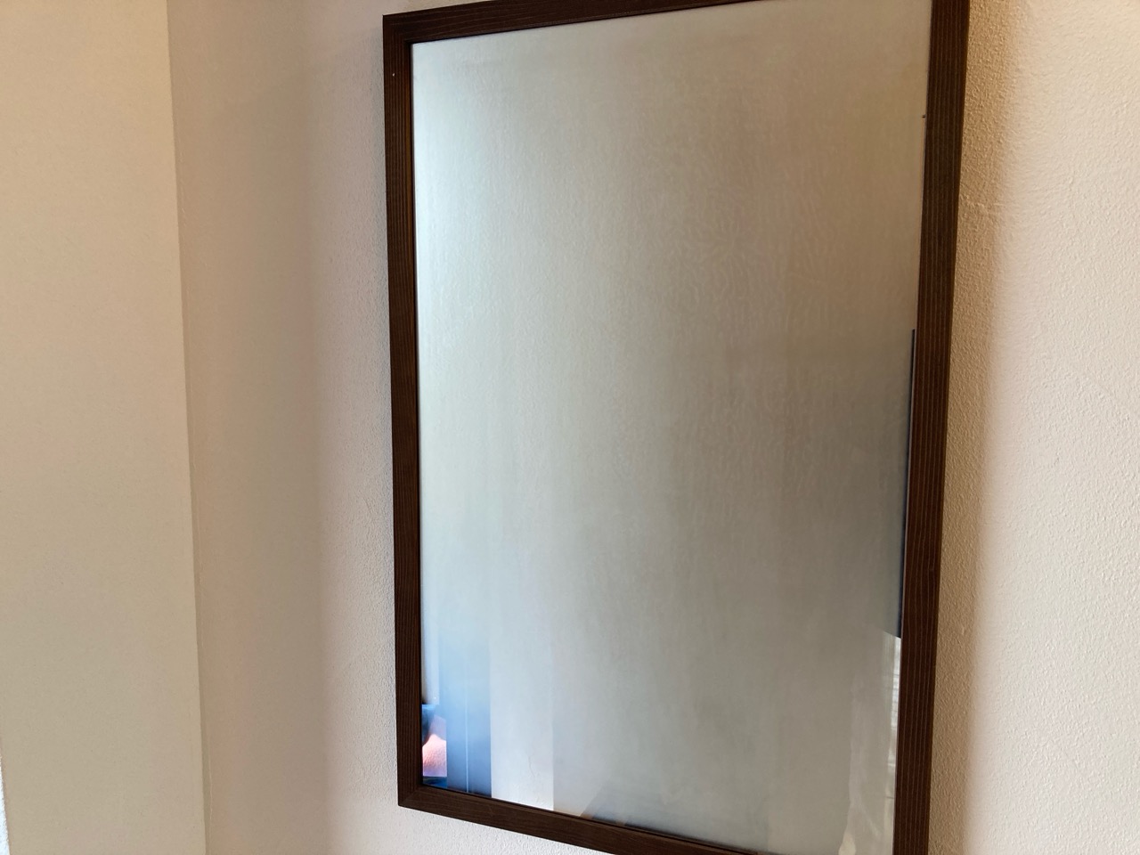 本日幸田町付近は午前中に小雨が降り、外気温は25℃前後。数字だけ見れば涼しそうな温度ですが、梅雨特有の高湿度によって非常に蒸し暑い気候です。屋内はチェックのために一昨日からエアコン20℃設定でいました。室内は二日間にわたって強力に冷やされているため(室温18.8℃、『キンキンに冷えてやがるっ・・・!!あ・・・・ありがてえっ・・・・・・!』←●イジより)玄関を開け放して作業しているとホールに掛けてあるミラーがこの通り一瞬で結露するという現象。