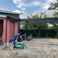 離れの外壁作業を横目にs水監督と筆者で建物の位置出しにかかります。まずは北世帯の建物、元々母屋が建っていた部分に一回り小さくした建物を新築します。郊外の土地につき、位置出しの際に基準となる目印が無く、あったとしても樹木に遮られ、なかなか信用できる基準点がありませんが、離れの基礎コンクリートを目印として位置を出していきました。