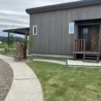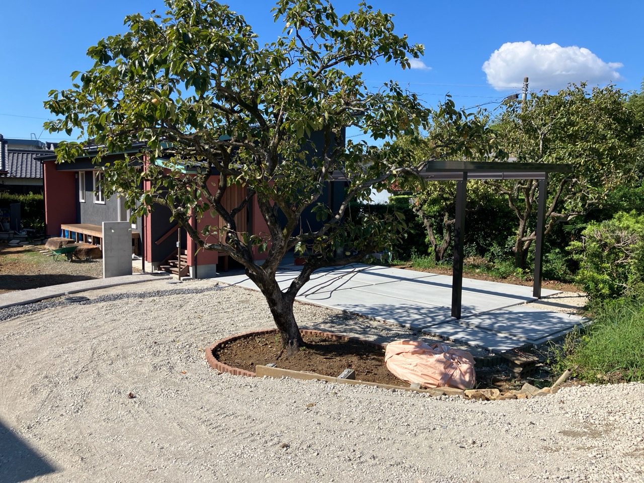 解体前の趣を少し残しつつも現代風のオープンな外構、駐車場もできあがって、だいぶすっきりした印象があります。これから毎年、芝刈りにお父様の腕前が発揮される事と思います。