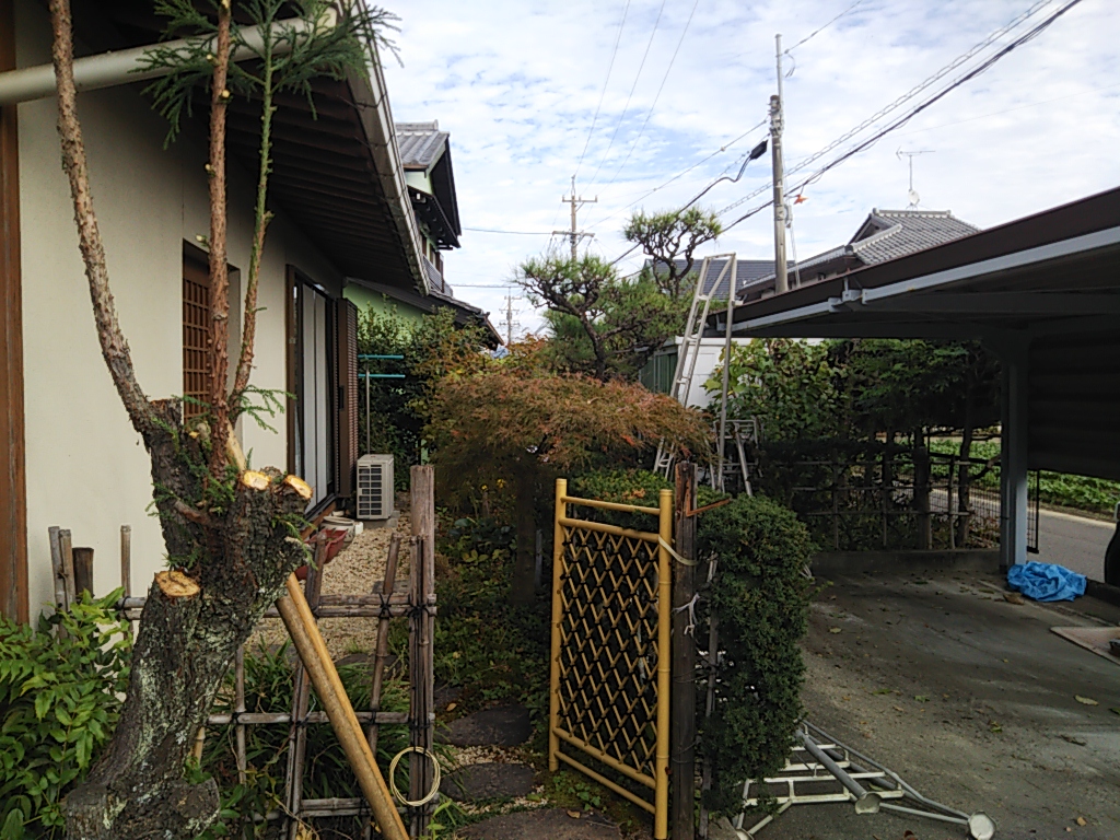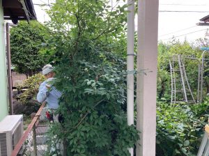 お茶室に花を活けるので、と昨年に樹木を剪定した際に残しておいた3本も枝葉が生い茂ってきたので再度剪定を依頼されました。他の樹木もこの一年でまただんだんと繁ってきた感があります。庭木の手入れも住宅の維持管理で重要な事と言えます。