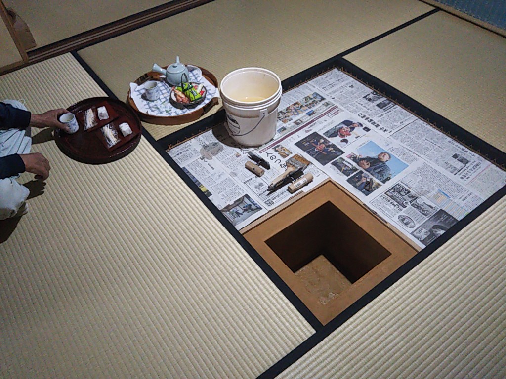 茶室の中に切ってある炉の内側の土壁が長年の仕様で傷んできましたので塗り替えてもらいました。この炉は以前にも数回補修を行っており、その時もこの左官屋さんが補修にあたりました。m様は当時の材料を大切に保管され、記録を見るに『平成九年』の文字、じつに20年以上保管されていたことになります。住宅も長くきれいに大切に使っていただきありがたい事です。