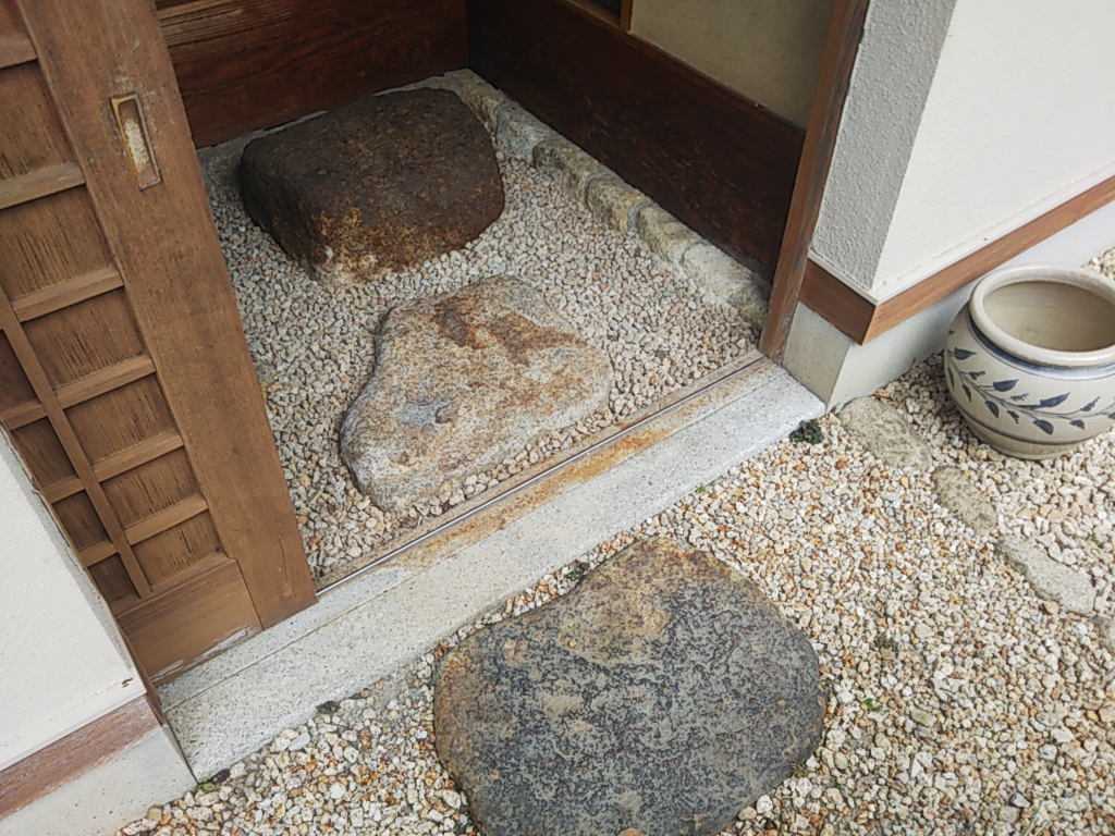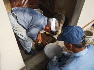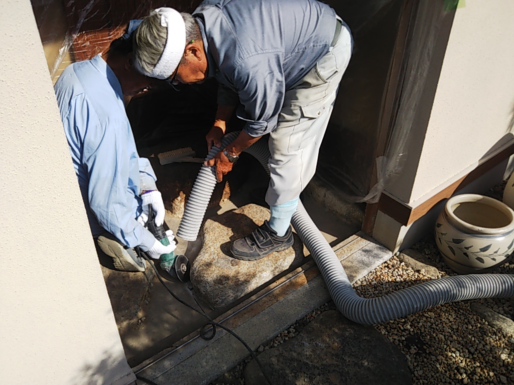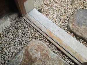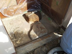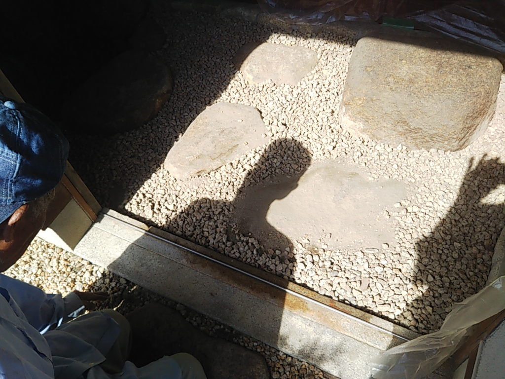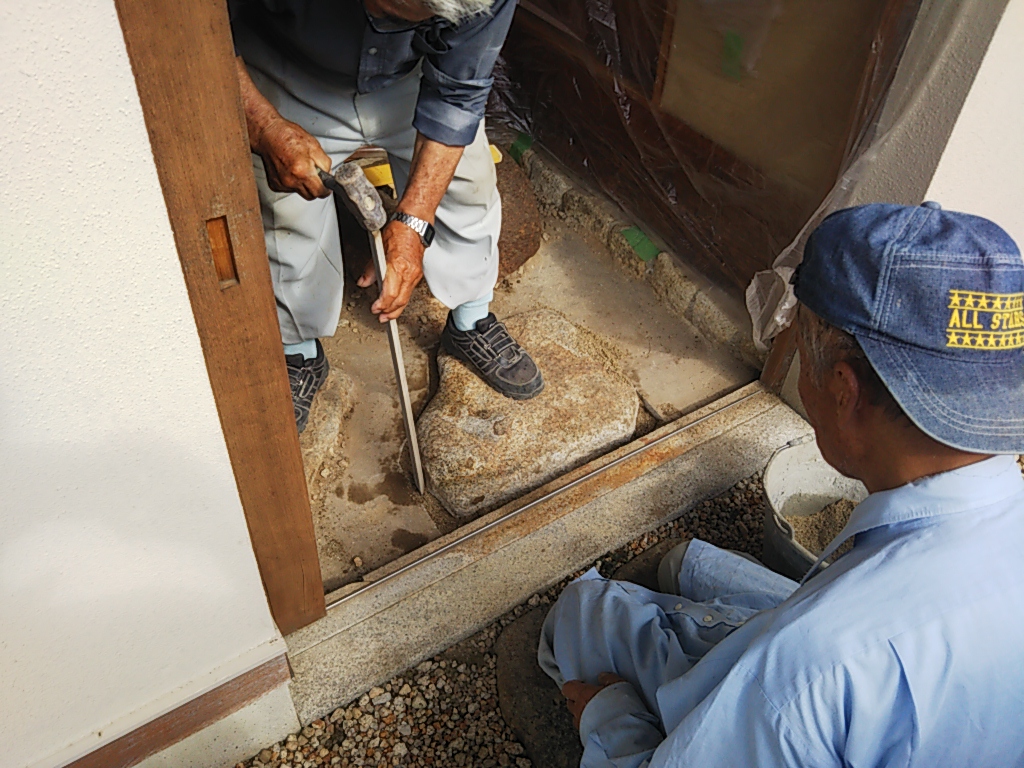 手前の露地部分の石が敷居の御影石よりもわずかに高く、建具が引っ掛かって外れませんので、まずは石の高さ調整から行います。