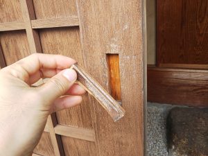 木製の引手も当時の接着剤が乾いて取れてしまったので、新たに交換を行います。
