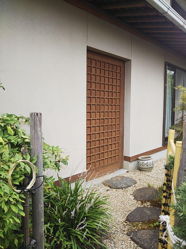 m様は茶道教室の先生でもあり、庭から茶室に入る出入口は趣のある木製の引戸になっています。反面、30年間風雨にさらされた影響でだいぶ傷みが出てきています。最近では戸車の調子が悪く開閉に力がいるようになってきたのだとか。
