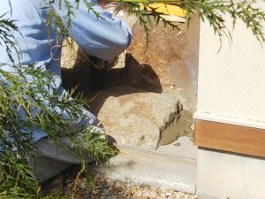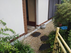 再度周りにモルタルを塗り込み、寄せておいた砂利を戻して完了。これで露地の木製建具は取り出せるようになりましたので、建具屋さんに調整を行ってもらえます。
