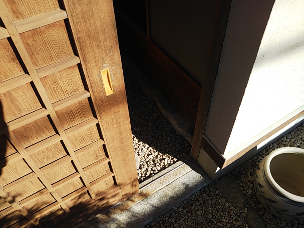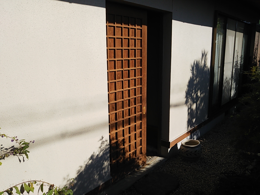 露地の建具の建てつけ合せをして完了。以前は扉を閉める最後の10㎝程でかなり腕に力を入れないと閉まらなかった戸が、調整後はフェザータッチの軽やかさ。茶道教室にお稽古に見える方はいきなりの力の入れ具合の変化にびっくりするかもしれません。
