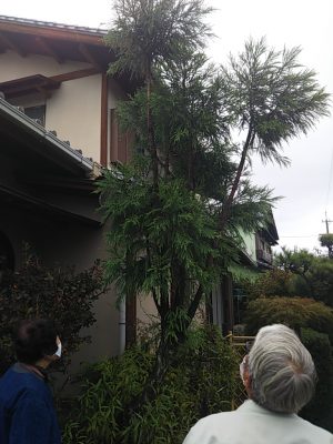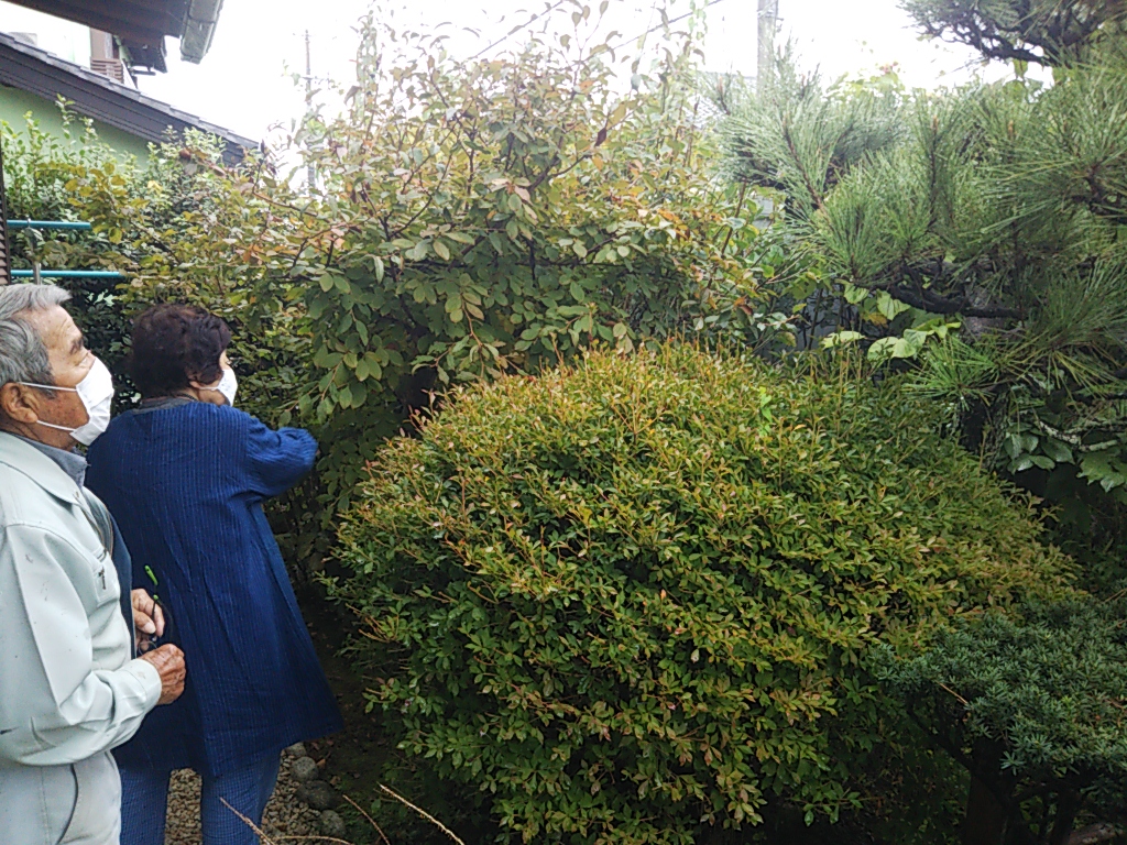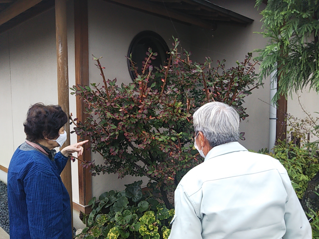 茶道の先生のご自宅ですので、庭木も茶道の稽古に使用される大事なものとの事。必要な部分は残しつつ、伸び切ってしまった枝などを落とす、というお打合せ内容となりました。