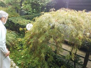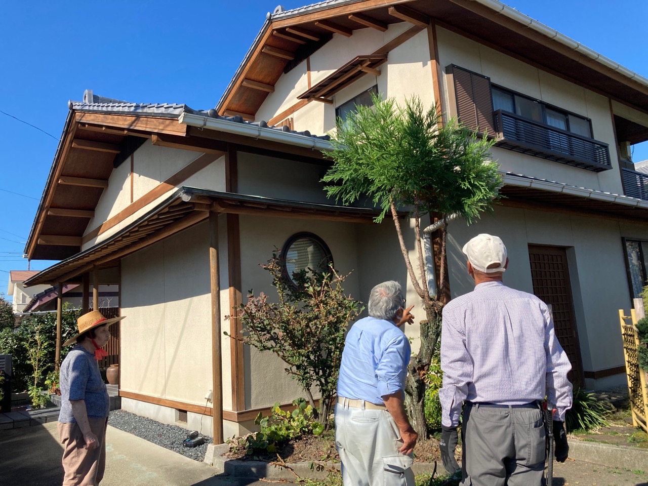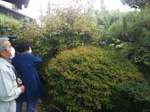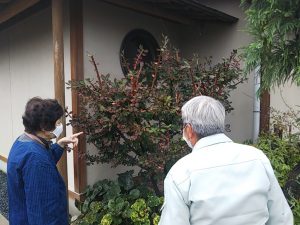 今回は、だいぶ伸びてきた庭木の剪定作業のための下見にうかがいました。お庭には数々の種類の庭木が植樹されていますが、その量的に個人で剪定するのはなかなか困難です。造園業者さんとともに、どこをどれだけ剪定するかのお打合せをしました。