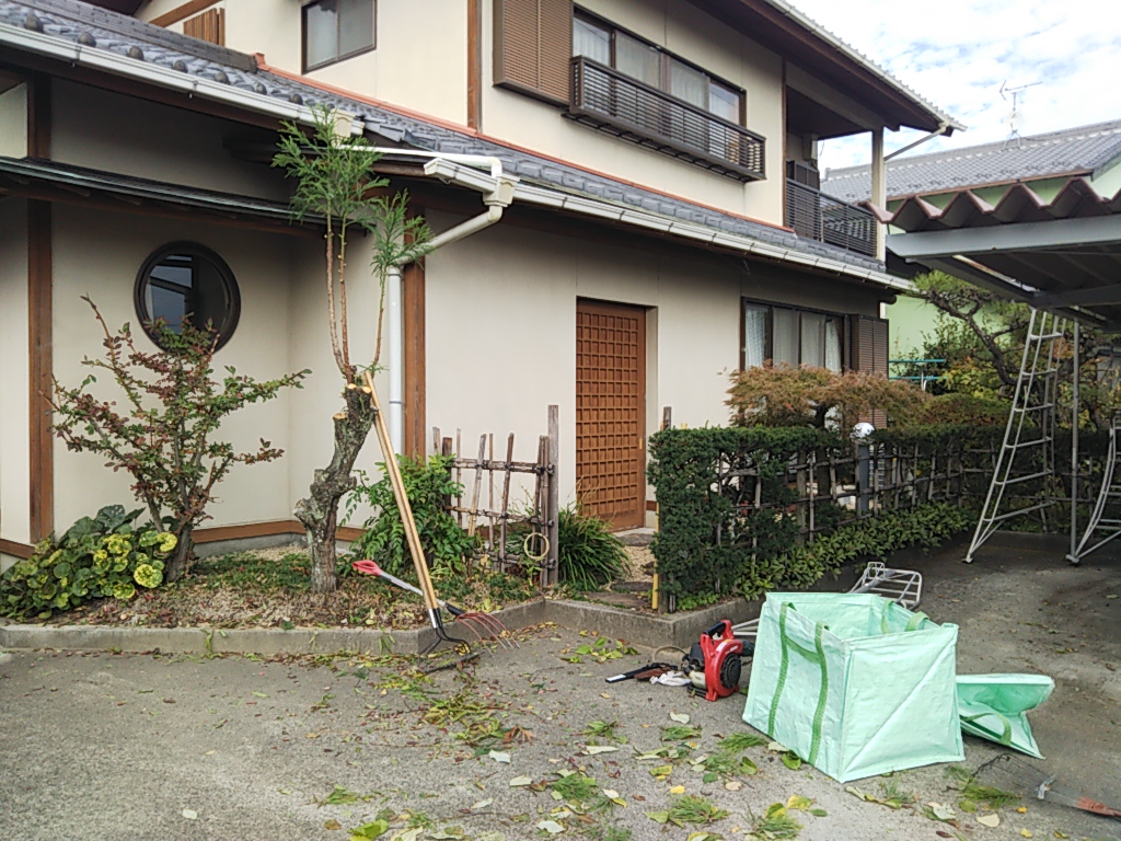 庭木の剪定作業を行っています。作業前はかなり鬱蒼とした印象でしたが、大きく枝打ちしたのでかなりすっきりしました。