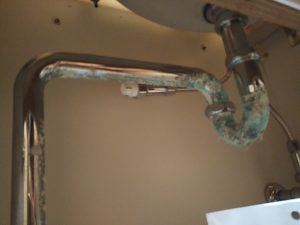 トイレの壁面に取付けるタイプの手洗器の配管が腐食してきた、という事で現場を確認にうかがいました。配管部分はキャビネット扉に隠れるタイプの手洗器です。同行した設備業者によると、キャビネット内に酸性の洗剤を保管していた事が原因と考えられるという事でした。キャップを閉めるボトルタイプの洗剤は良いのですが、スプレーで吹き付ける容器に入った洗剤でノズル口が『止』⇔『出』と切り替えられるものを『出』のままにしておくと、洗剤が揮発したりしてキャビネット内の金属を腐食させる事があるそうです。