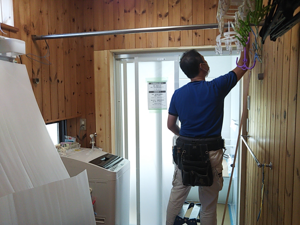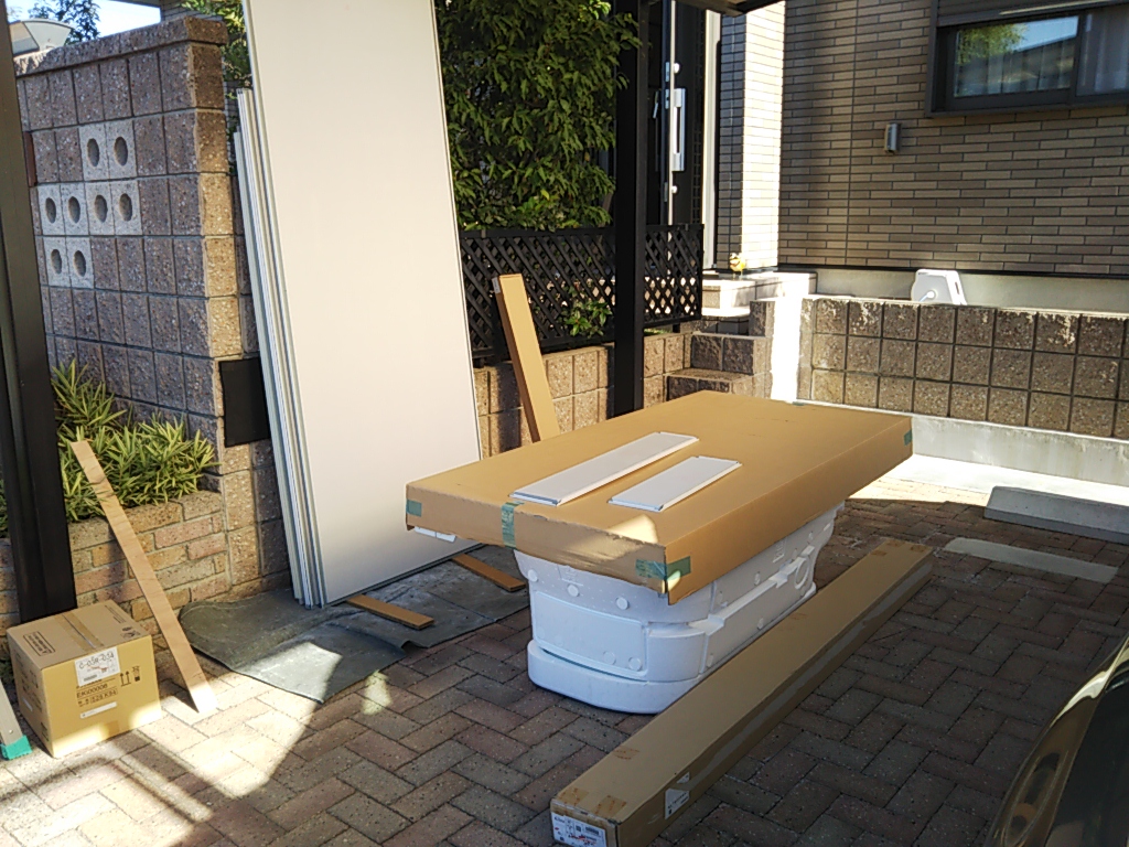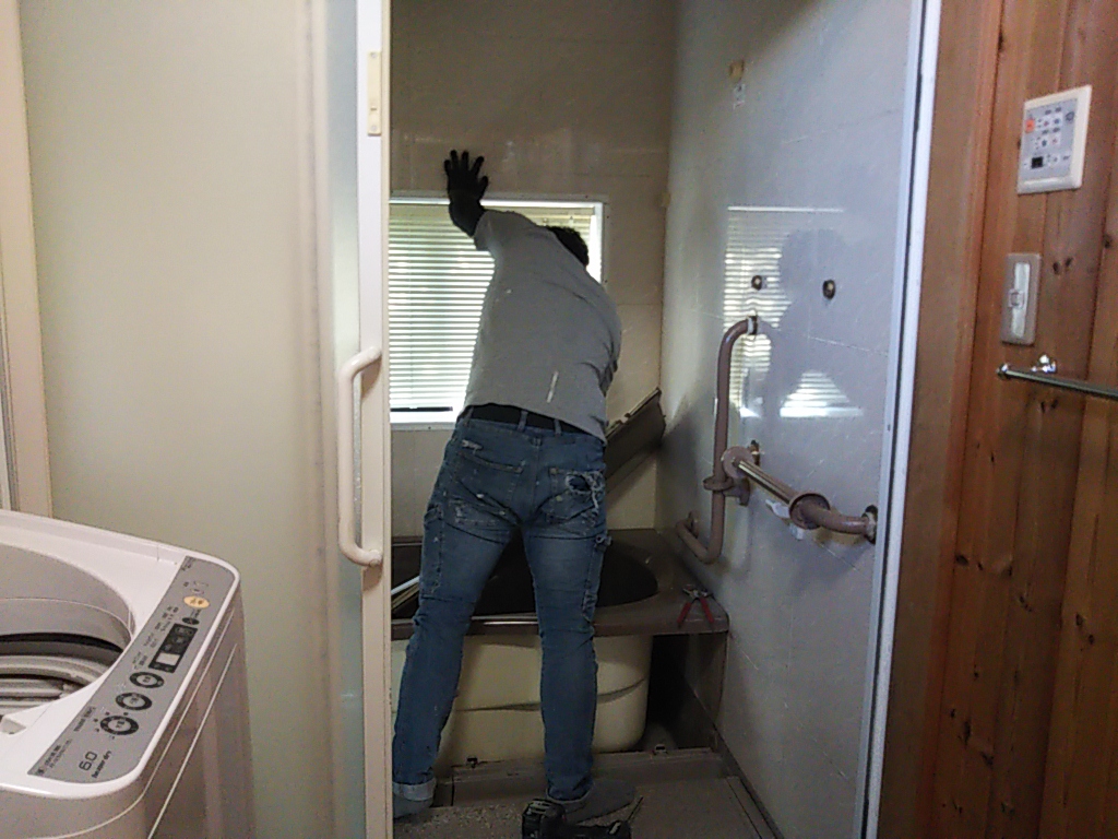 8月に採寸、検討していた旧ユニットバスから新ユニットバスへの交換工事がスタートしました。ユニットの解体に際して、水道管の接続を外し、窓のブラインドを外し、と施工した時とは逆の手順で外していきます。