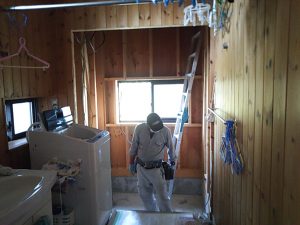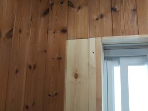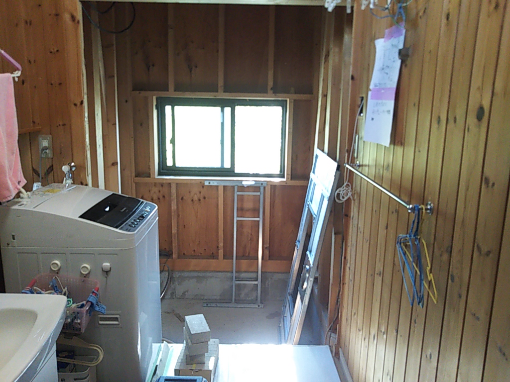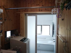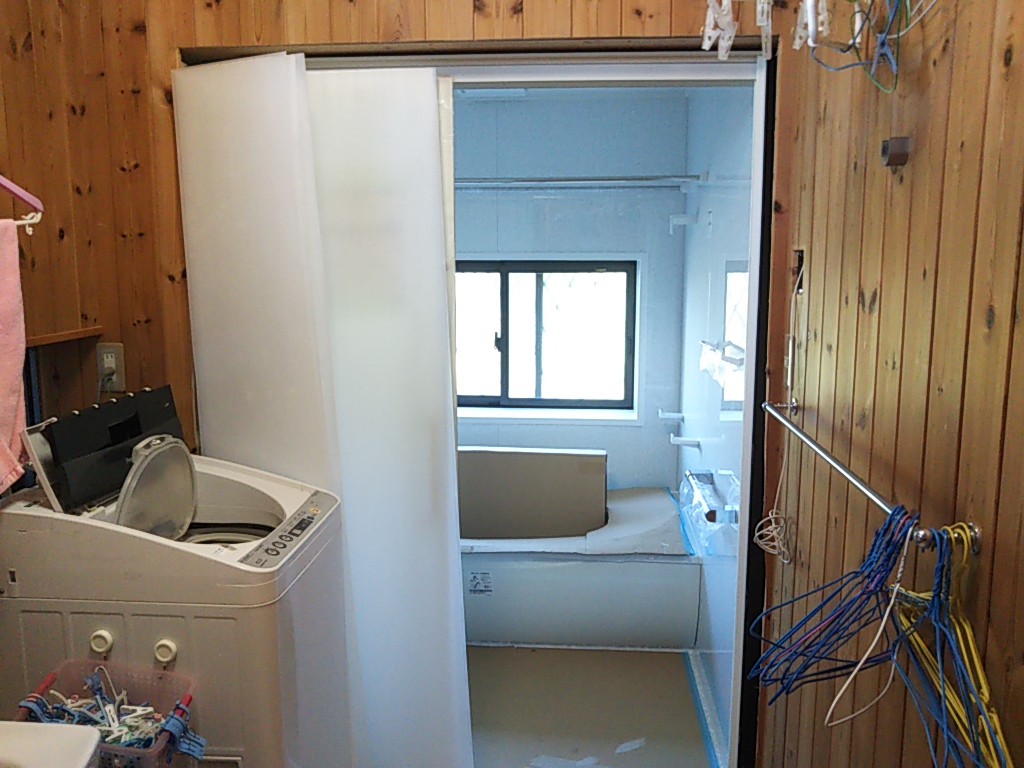 新しいユニットバスの出入口の大きさに合わせて脱衣室側の枠の造作工事を行います。脱衣室の内装はパインの羽目板を使っていましたが、たまたま20数年前と同じ寸法、収まりの羽目板がありましたので使ってみたところピッタリと一致。後は自然に日焼けしていけば違和感がなくなります。
